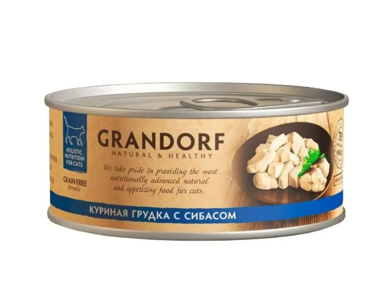 Описание о корме Grandorf консервы для кошек куриная грудка с сибасом