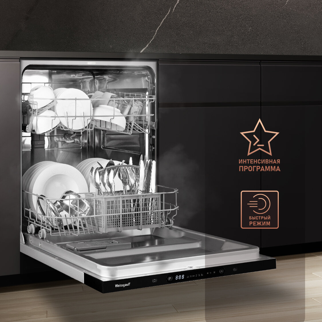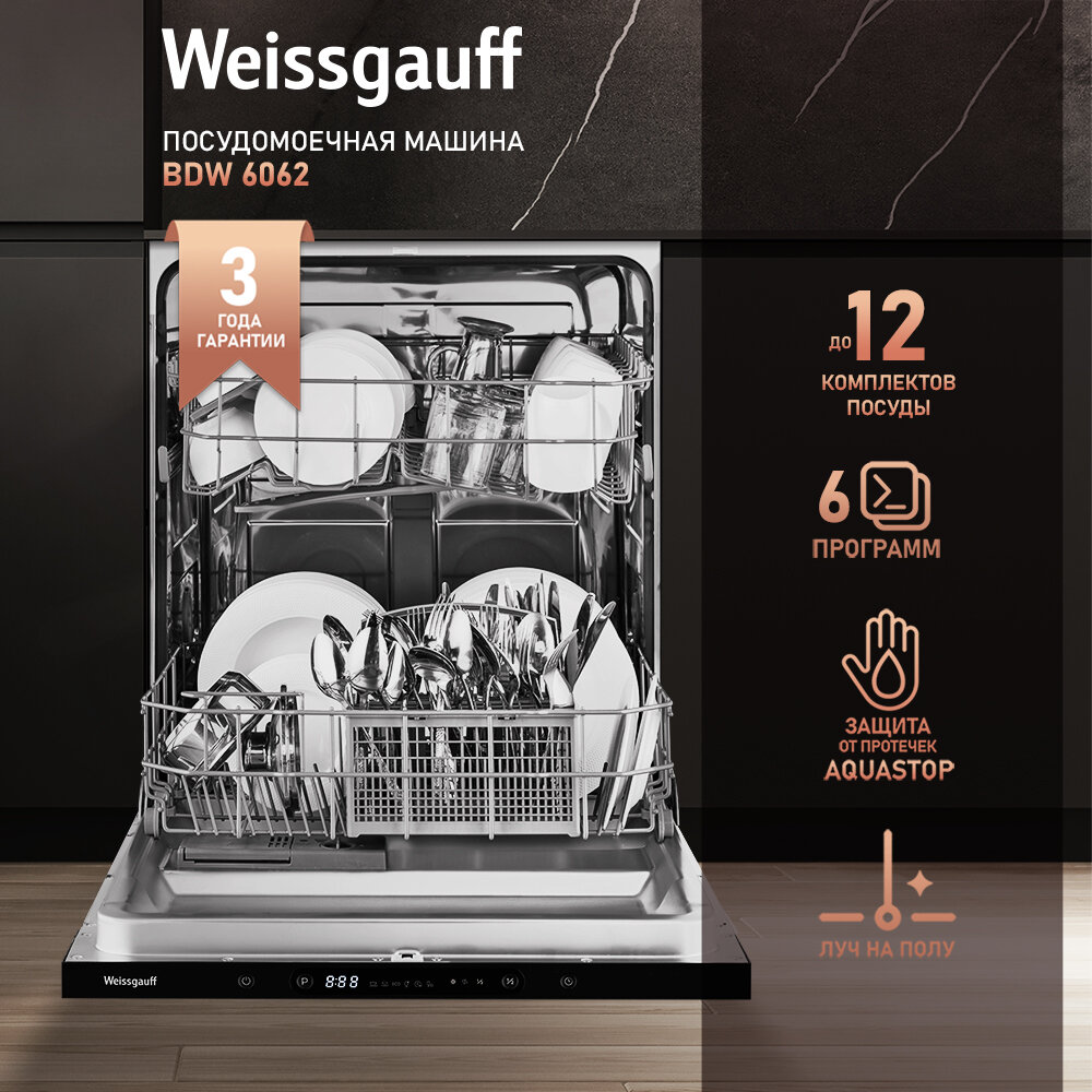 Посудомоечная машина Weissgauff BDW 6062 D, загрузка 12 комплектов посуды, количество программ 6, расход воды до 17.5л, встраивается полностью ()