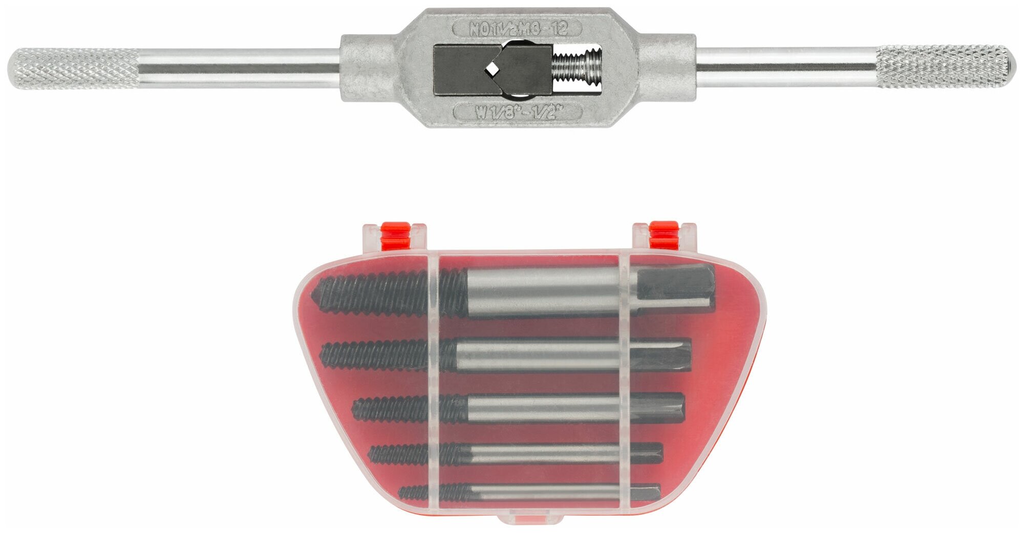 | Прочие особенности и свойства | Для выкручивания шурупов и болтов с поврежденным шлицем.,,Материал:экстракторы из хром-молибденовой стали S2, корпус воротка из цинкового сплава, ручки и зажим воротка из инструментальной стали. |