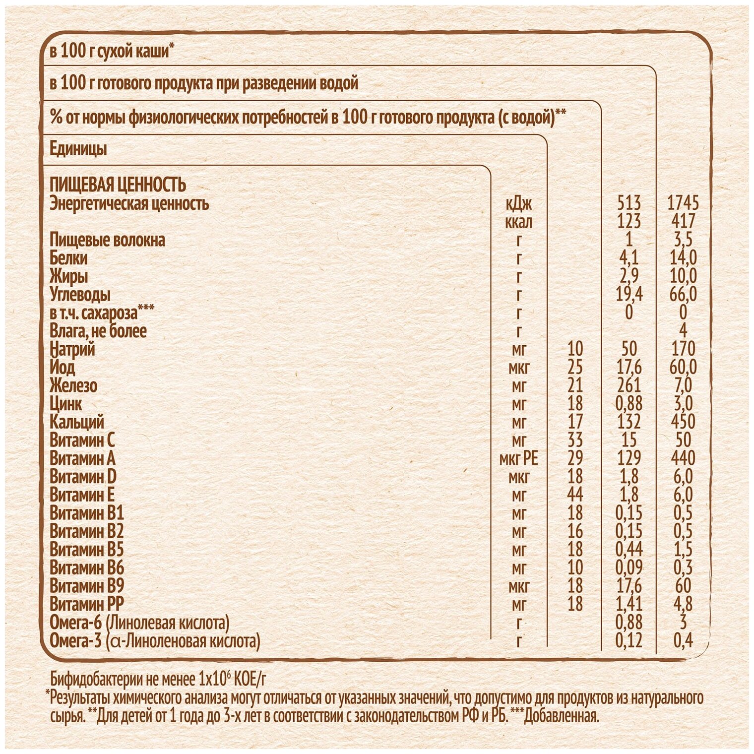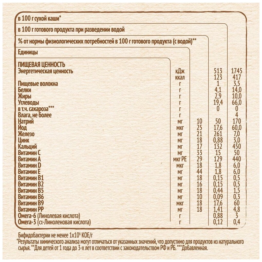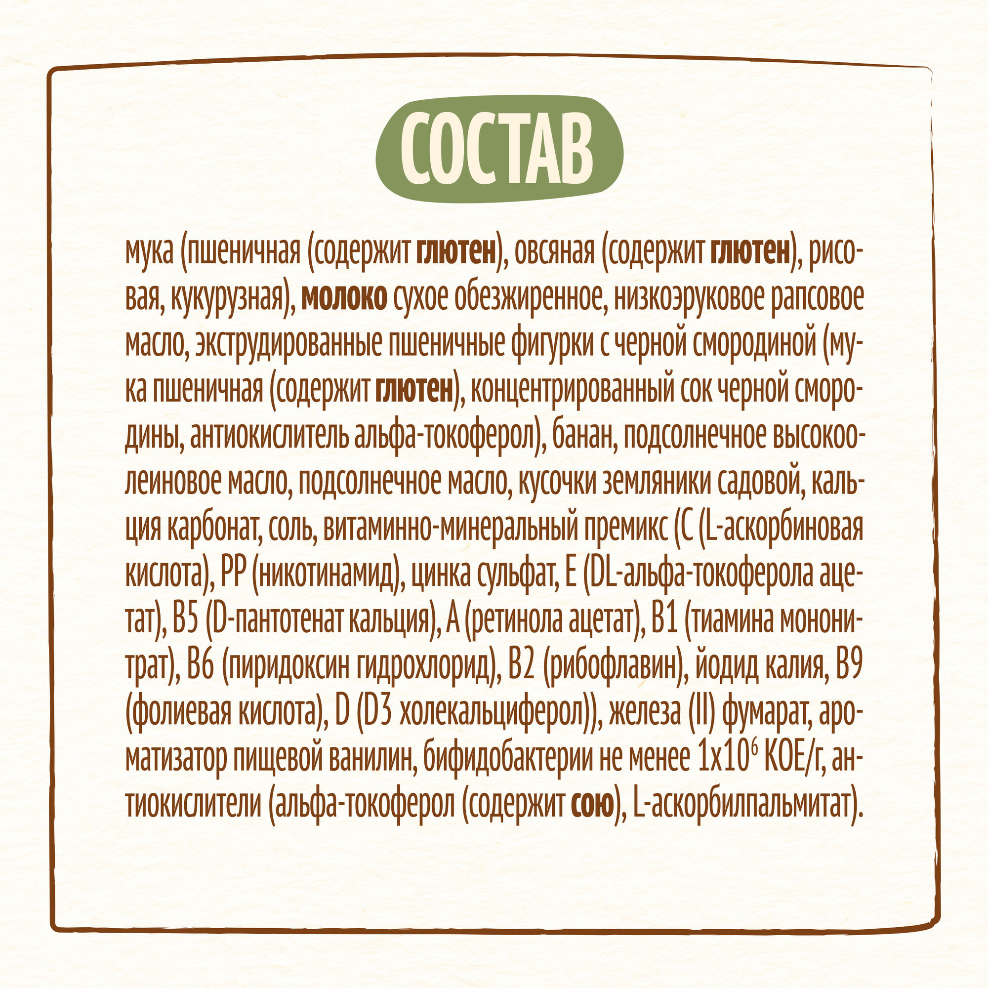 | Состав | Мука (пшеничная (содержит глютен), овсяная (содержит глютен), рисовая, кукурузная), молоко сухое обезжиренное, низкоэруковое рапсовое масло, экструдированные пшеничные фигурки с черной смородиной (мука пшеничная (содержит глютен), концентрированный сок черной смородины, антиокислитель альфа-токоферол), банан, подсолнечное высокоолеиновое масло, подсолнечное масло, кусочки земляники садовой, кальция карбонат, соль, витаминно-минеральный премикс (С (L-аскорбиновая кислота), РР (никотинамид), цинка сульфат, E (DL-альфа-токоферола ацетат), B5 (D-пантотенат кальция), A (ретинола ацетат), В1 (тиамина мононитрат), В6 (пиридоксин гидрохлорид), В2 (рибофлавин), йодид калия, B9 (фолиевая кислота), D (D3 холекальциферол)), железа (II) фумарат, арома- тизатор пищевой ванилин, бифидобактерии не менее 1х106 КОЕ/г, антиокислители (альфа-токоферол (содержит сою), L-аскорбилпальмитат). |