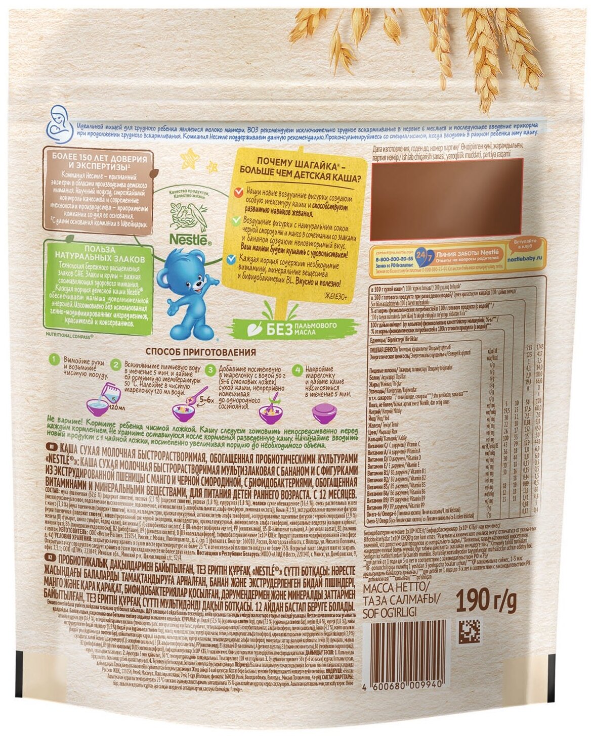 Молочная каша Nestl?® "Шагайка" Мультизлаковая с бананом и с фигурками из пшеницы с натуральным соком манго и черной смородины. Разработана специально для детей старше 12 месяцев. Вкусная новинка в линейке каш Nestl?® ШАГАЙКА! Нежная молочная мультизлаковая рецептура с добавлением пшеничных фигурок с натуральным соком манго и черной смородины!