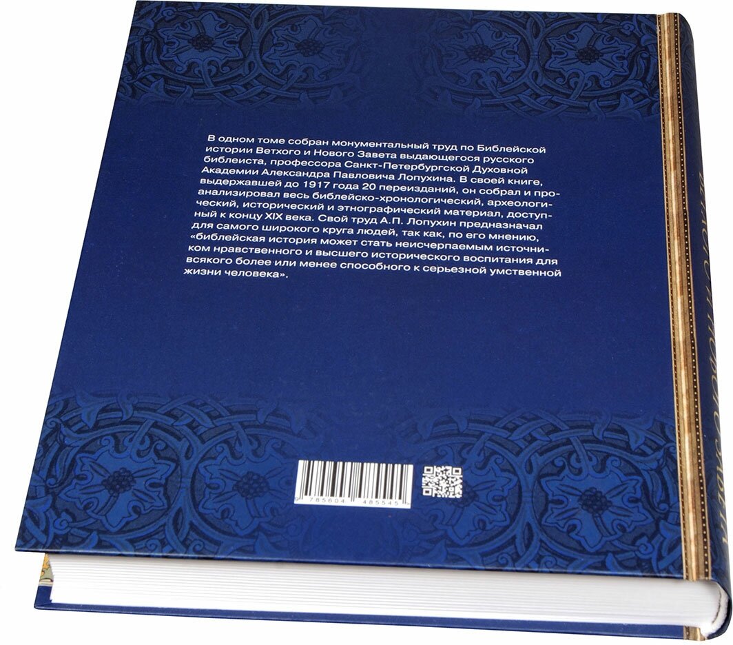 В одном томе собран монументальный труд по Библейской истории Ветхого и Нового Завета выдающегося русского библеиста, профессора Санкт-Петербургской Духовной Академии Александра Павловича Лопухина. В своей книге, выдержавшей до 1917 года 20 переизданий, он собрал и проанализировал весь библейско-хронологический, археологический, исторический и этнографический материал, доступный к концу XIX века. Свой труд А.П. Лопухин предназначал для самого широкого круга людей, так как, по его мнению, "библейская история может стать неисчерпаемым источником нравственного и высшего исторического воспитания для всякого более или менее способного к серьезной умственной жизни человека".
