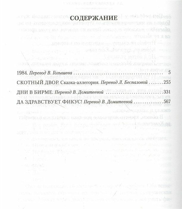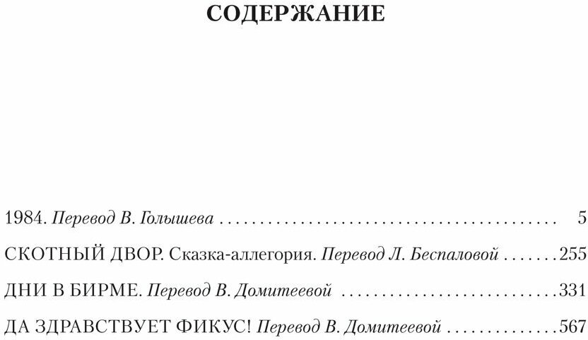 В настоящий сборник также включены знаменитая сатирическая сказка-притча «Скотный Двор» (1945), посвященная теме преданных завоеваний революции (позднее развитой в «1984»), автобиографический роман «Дни в Бирме» (1934) – жесткое и насмешливое обличение романтического мифа о европейской цивилизации, несущей свет колонизированным народам Востока, – и роман «Да здравствует фикус!» (1936), ироничное и печальное повествование о том, как поэт-неудачник Джон Комсток объявил войну Бизнес-богу, отказавшись жить ради денег, достойного социального статуса и других обывательских ценностей (символом которых он считал выставленный на подоконнике фикус), – и о том, к чему это привело.