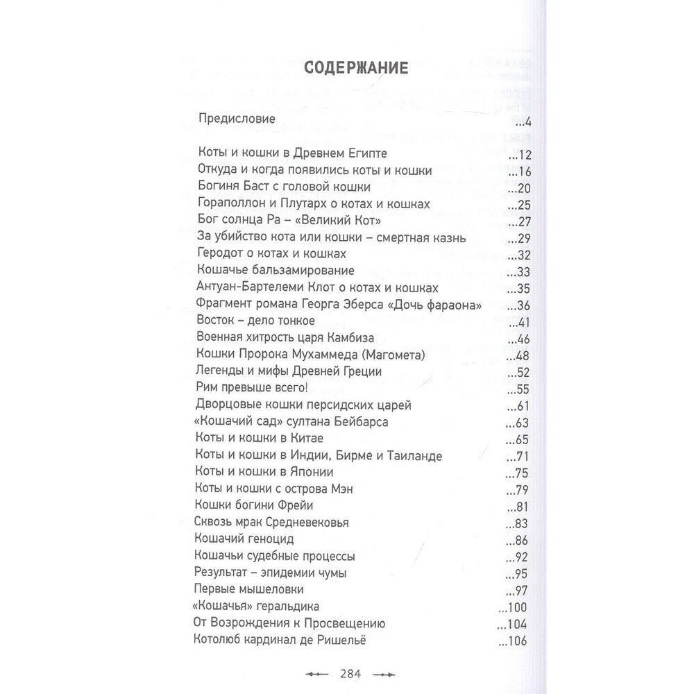 Книга состоит из коротких глав, список которых есть в оглавлении. Многие главы посвящены котам знаменитых людей - Кардинала Ришелье и французских королей, Никола Теслы, Генри Форда и Черчилля, Пикассо и других деятелей искусства, также есть заметки о кошках в разных культурах, например, в Китае, Японии, вообще на Востоке и в арабских странах. Историческая хронология прослеживается четко - от кошек в Древнем Египте до современности.