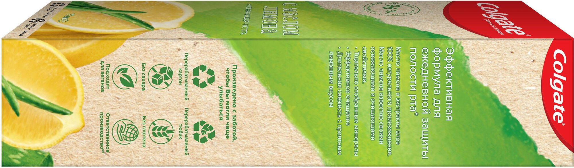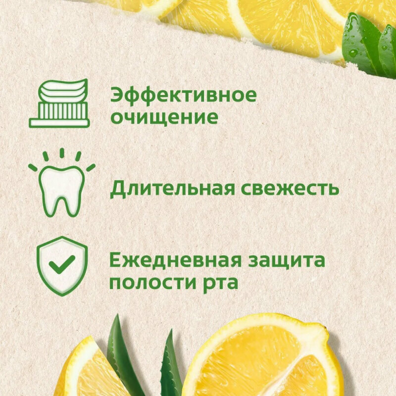 Наш 1-й перерабатываемый тюбик! Освежающая чистота с маслом лимона и экстрактами алоэ 100% натурального происхождения. Зубная паста с эффективной формулой подходит для ежедневной защиты полости рта* и обеспечивает длительную свежесть с приятным лимонным вкусом. Масло лимона известно своими освежающими и очищающими свойствами. Продукт произведен с заботой, чтобы Вы могли чаще улыбаться! Не содержит глютен, подходит для веганов, ответственно произведен**
