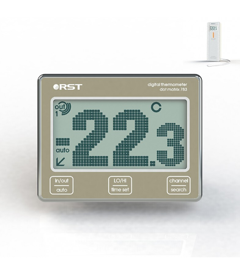 Цифровой термометр с новым анемированным точечно матричным дисплеем. Большой контрастный экран на котором отображена температура воздуха в помещении и/или на улице, полученная с радиодатчика. Кроме того на дисплее отображена макимальная и минимальная температура за текщие сутки и тенденция изменения температур. Беспроводный термометр может быть установлен в любом месте: на подставку, повешен на стену, на верёвку, при помощи магнита легко крепится на металлическую поверхность.