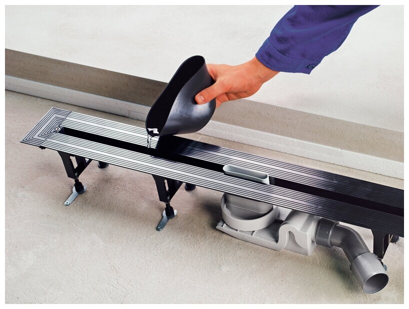Комплектация: монтажные опоры, торцевые заглушки, сифон с функцией самоочищения, регулируемое по высоте крепление для дизайн-вставки, компенсатор высоты, фланец для нанесения/закрепления гидроизоляции, набор уплотнений, шаблон для укорачивания.