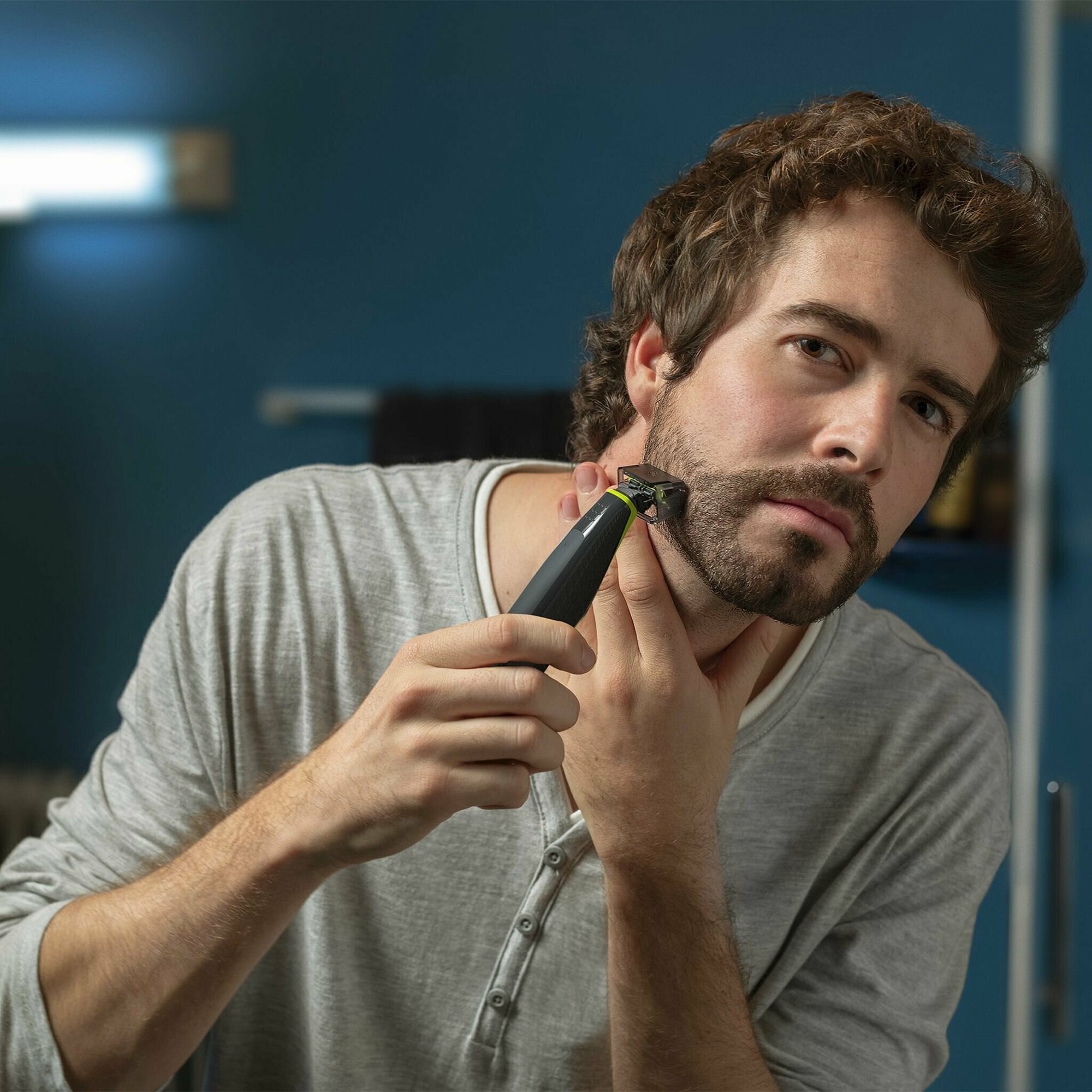 Philips OneBlade — это новое революционное гибридное устройство для бритья. Для комфортного бритья OneBlade сбривает щетину не слишком близко к коже, оставляя ощущение лёгкой вечерней небритости. Он водонепроницаем, так что его очень легко очищать, достаточно сполоснуть водой под краном. Вы также можете выбирать любой способ бритья — с пеной или сухое бритье.