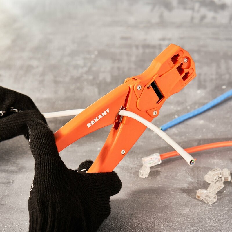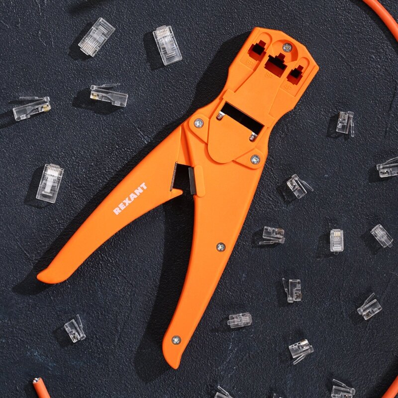 Кримпер REXANT — универсальный инструмент для обжима разъемов RJ-45 (8P8C), RJ-12 (6P6C), RJ-11 (6P4C и 6P2C) и RJ-10 (4P4C), а также для снятия изоляции и обрезки проводов.