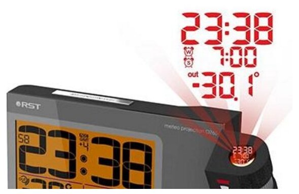 RST - это уникальные часы главной фишкой которых является проектор с повышенной четкостью изображения который проецирует время и значение температуры на стену или потолок помещения. Такая интересная возможность позволяет отображать значение текущего времени в тех местах комнаты в которые поставить обычные часы невозможно или нецелесообразно. Вам достаточно совершить небольшой поворот головы и Вы сразу узнаете время в текущий момент.