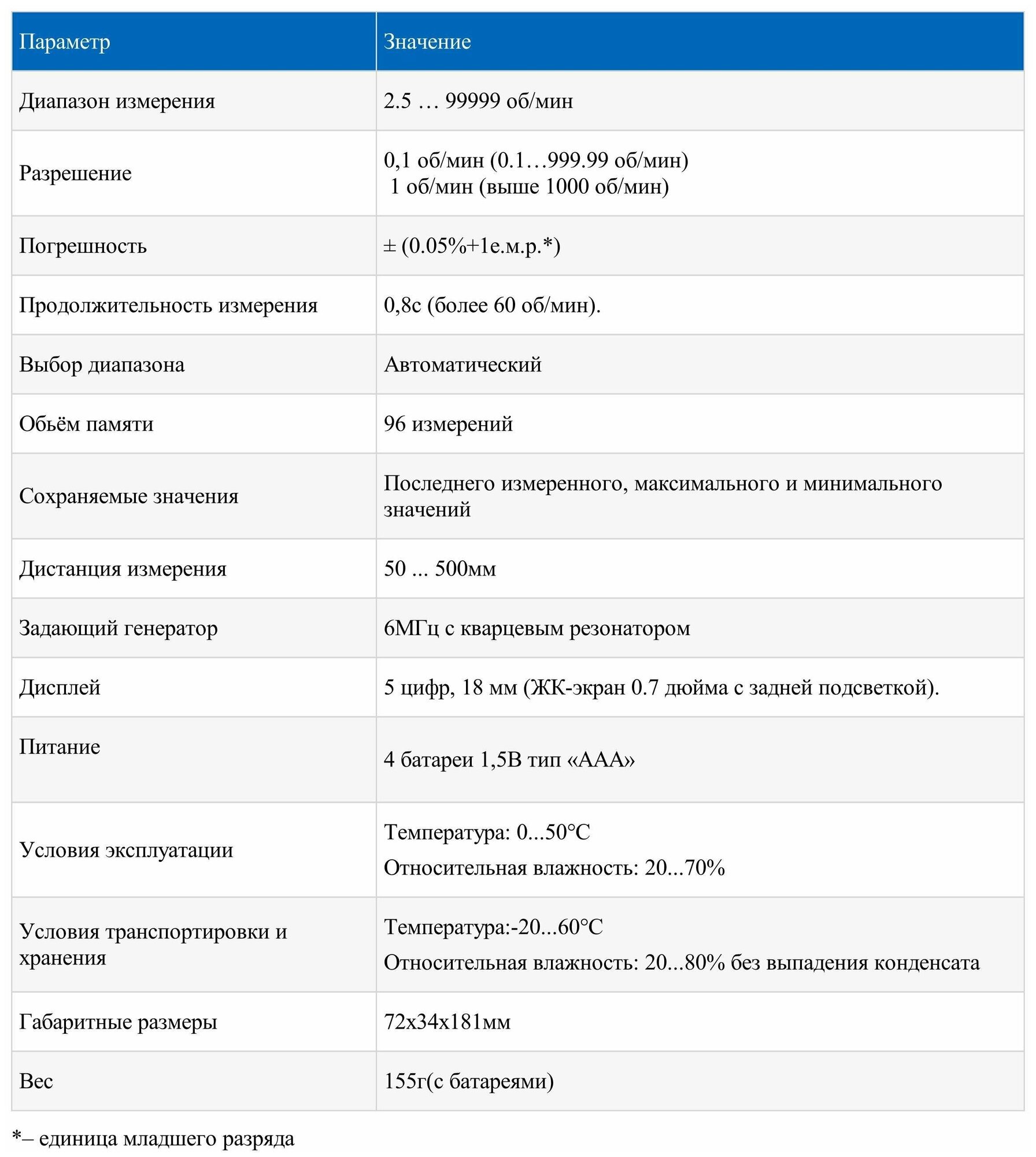 | Диапазон измерений частоты вращения | от 2.5 до 99999 |