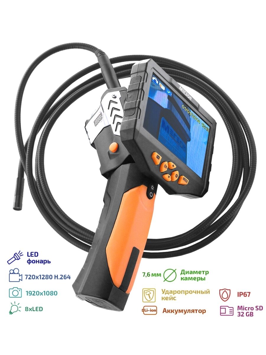 Видеоэндоскоп МЕГЕОН оснащен цветным дисплеем (2,31 дюйма) с регулируемой яркостью. МЕГЕОН , как и другие эндоскопы МЕГЕОН, являются необходимым инструментом для визуального осмотра труднодоступных мест, скрытых полостей, внутренних частей автомобилей и других сложных механизмов. Стоит отметить, что данный видеоскоп позволяет производить вышеперечисленные действия без предварительного демонтажа деталей и повреждения исследуемых конструкций. Все это стало возможным благодаря полугибкому измерительному зонду, которым оснащен МЕГЕОН . Длина зонда составляет 980 мм, а регулируемая подсветка камеры обеспечивает отличную видимость даже в неосвещенных полостях. Влагозащищенный корпус измерительного зонда соответствует стандарту IP67. Изображение с камеры выводится на дисплей видеоскопа, а при необходимости МЕГЕОН может быть подключен к персональному компьютеру или телевизору (при наличии видеокабеля).Преимущества Цветной дисплей высокой четкости Пылевлагозащищённое исполнение зонда по IP67 Компактный и эргономичный корпус прибора Вспомогательные насадки в комплекте Длина зонда составляет 980 мм Регулируемая подсветка дисплея и камеры Ударопрочный кейс