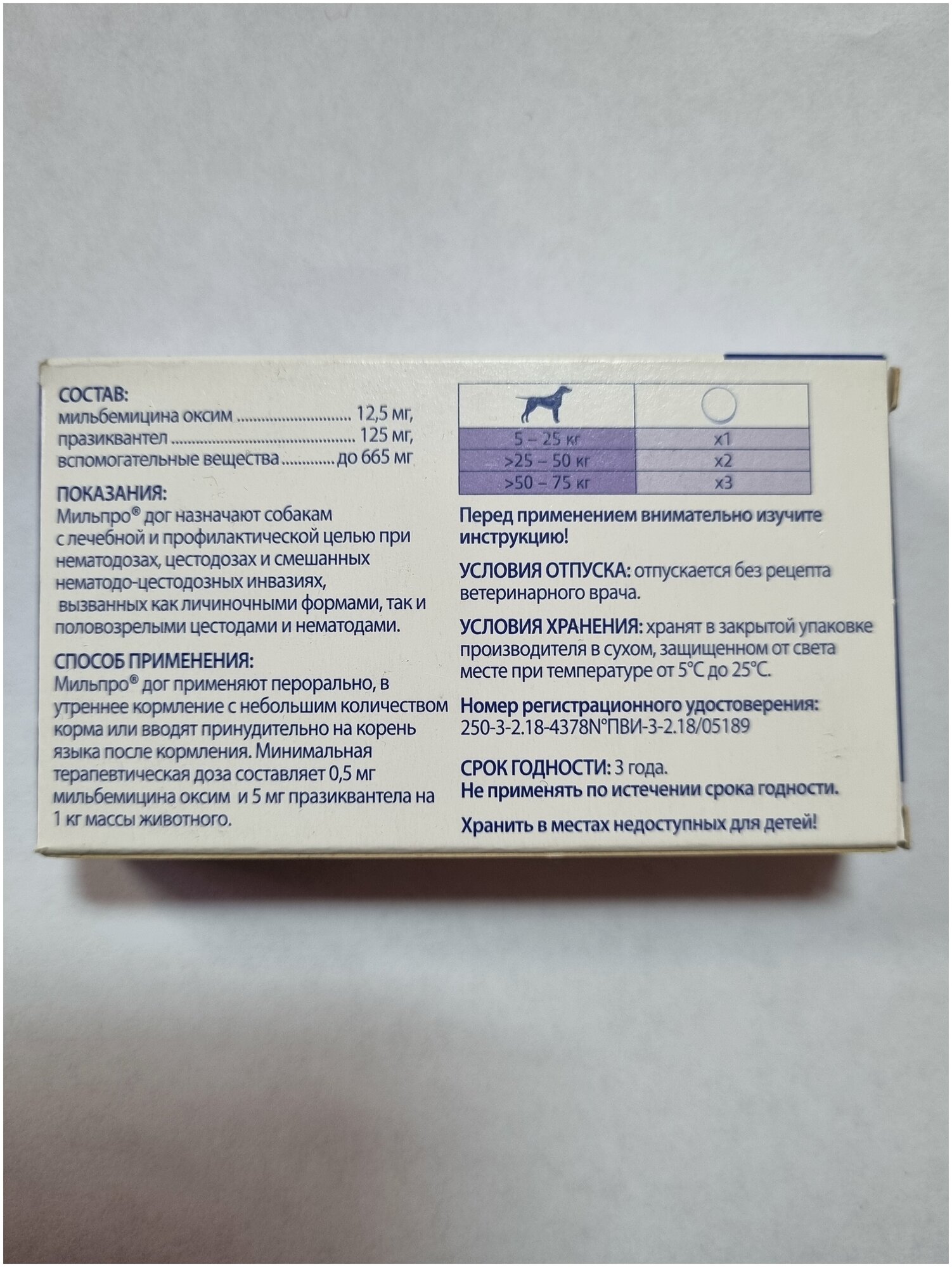 Фармакотерапевтическая группа лекарственного препарата: комбинированные антигельминтные лекарственные препараты.Комбинация мильбемицина оксима и празиквантела, входящих в состав препарата, обеспечивает широкий спектр его антигельминтного действия на взрослых цестод: Dipylidium caninum; Taenia spp, Echinococcus spp, Mesocestoides spp. и нематод: Ancylostoma caninum, Toxocara canis, Toxascaris leonina, Trichuris vulpis, Thelazia callipaeda, Crenosoma vulpis, Angiostrongylus vasorum, а также активна против личинок Dirofilaria immitis.Мильбемицина оксим - макроциклический лактон, получаемый в результате ферментативной деятельности Streptomyces hygroscopicus var. Aureolacrimosus, активен в отношении личинок и имаго нематод, паразитирующих в желудочно-кишечном тракте собак, а также личинок нематоды Dirofilaria immitis.Механизм действия мильбемицина обусловлен повышением проницаемости мембран нематод и насекомых для ионов хлора посредством глутамат-зависимых хлоридных каналов (относящиеся к гамка и глициновым рецепторам позвоночных). Это приводит к гиперполяризации мембран клеток нервной и мышечной ткани, периферическому параличу и гибели паразита.Празиквантел является ацилированным производным пиразинизохинолина, обладает выраженным действием против цестод на всех стадиях развития. Повышая проницаемость клеточных мембран паразита для ионов кальция, вызывает деполяризацию мембран, сокращение мускулатуры и разрушение тегумента, что приводит к гибели паразита и способствует его выведению из организма животного.Максимальная концентрация мильбемицина оксима в плазме крови собак достигается в течение 2-4 часов, период полувыведения t1/2 приблизительно 1 -4 дня, биодоступность составляет около 80%. Из организма соединение выводится в основном в неизмененном виде.Максимальная концентрация празиквантела в плазме крови собак достигается через 0,5-4 часа. Период полувыведения t1/2 приблизительно 1,5 часа. Соединение подвергается быстрой и практически полной биотрансформации в печени до моногидроксилированных (также возможно до ди- и тригидроксилированных) дериватов, которые, перед выведением в основном связываются с глюкоронидом и/или сульфатом. Уровень связывания в плазме составляет около 80%, выводится из организма с мочой, до 90% в течение 2-х суток.Мильпро дог по степени воздействия на организм относится к умеренно опасным веществам (3 класс опасности по 12.1.007-76). В рекомендуемых дозах не оказывают сенсибилизирующего, эмбриотоксического и тератогенного действия. Препарат токсичен для рыб и других гидробионтов.