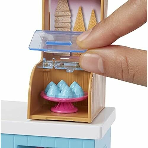 Уютное кафе-мороженое - идеальное место для куклы Барби и ее сестренки Челси, чтобы освежиться в жаркий день. В кафе вас ждет широкий выбор вкуснейших лакомств - рожки с мороженым, аппетитные кексы, напитки и многое другое. Барби и Челси могут сделать заказ, оплатить его на кассе и разместиться за столиком, чтобы насладиться любимым десертом. Дети с удовольствием будут угощать сестер в своем кафе и предлагать им на выбор все новые сладости!