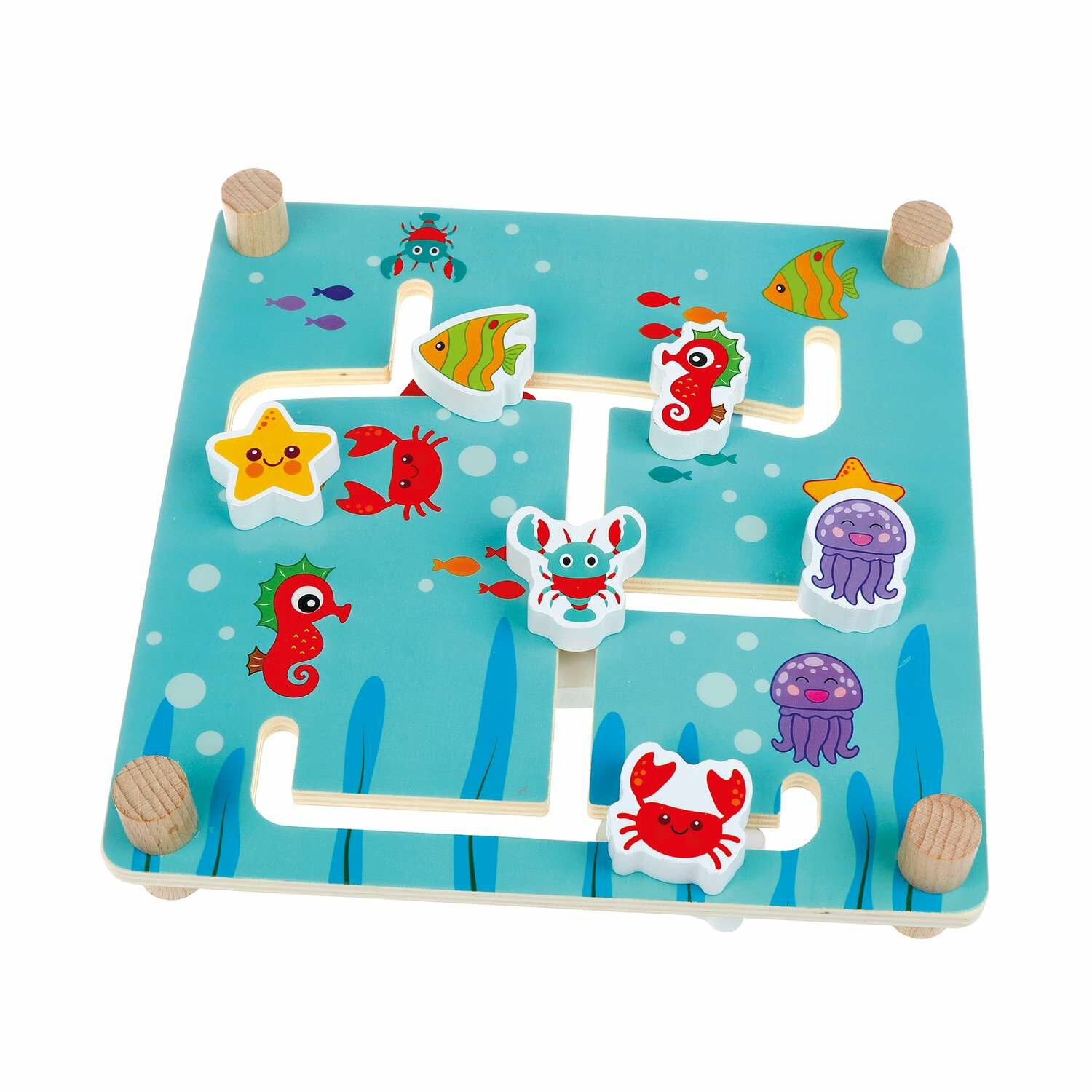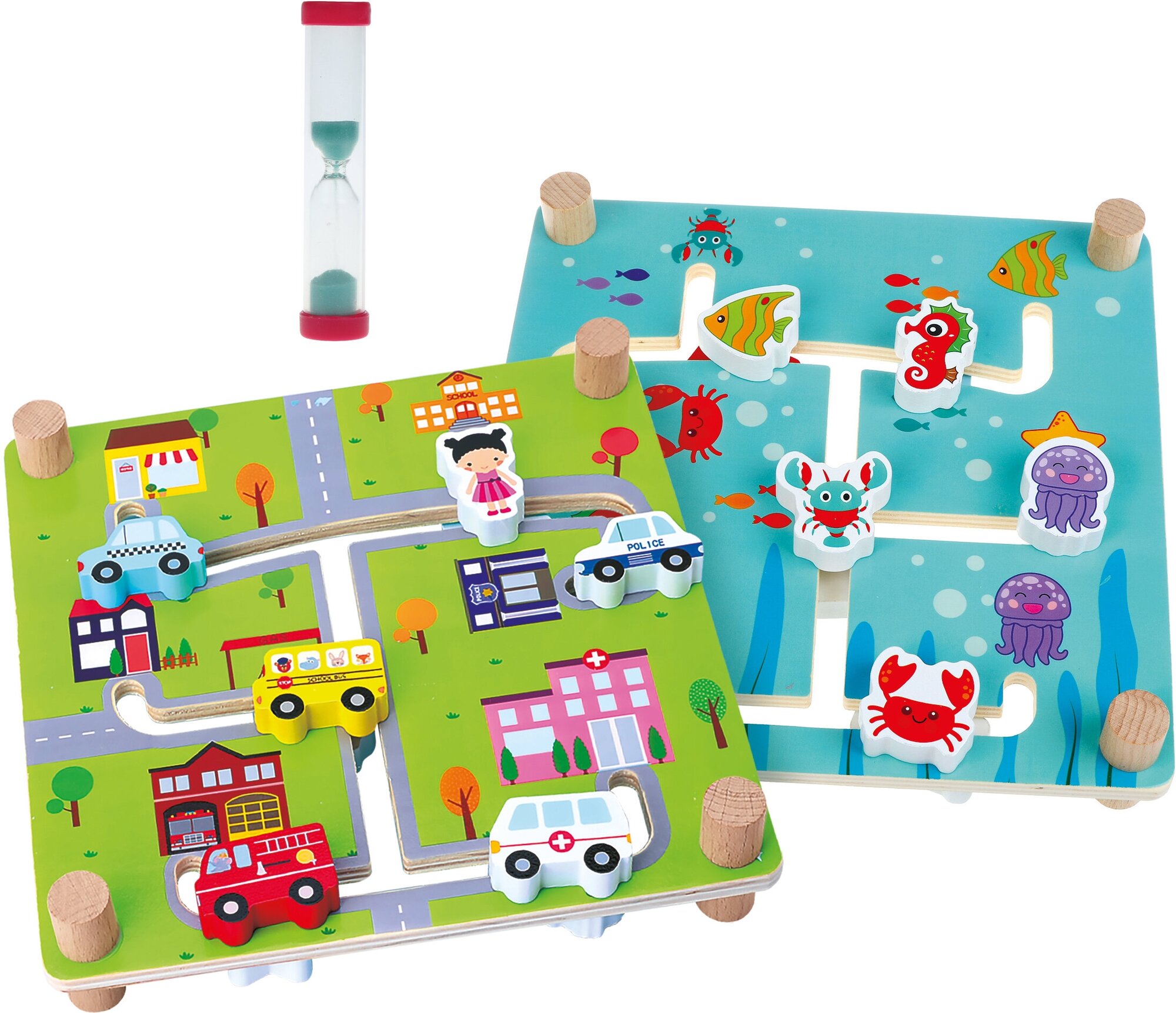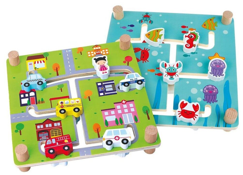 Лабиринт представляет собой двустороннее игровое поле. Одна из сторон выполнена в тематике городской жизни, подвижные фигурки на этой стороне сделаны в виде различных видов транспорта. На другой стороне изображён подводный мир, а красочные фигурки изображают забавных морских жителей.