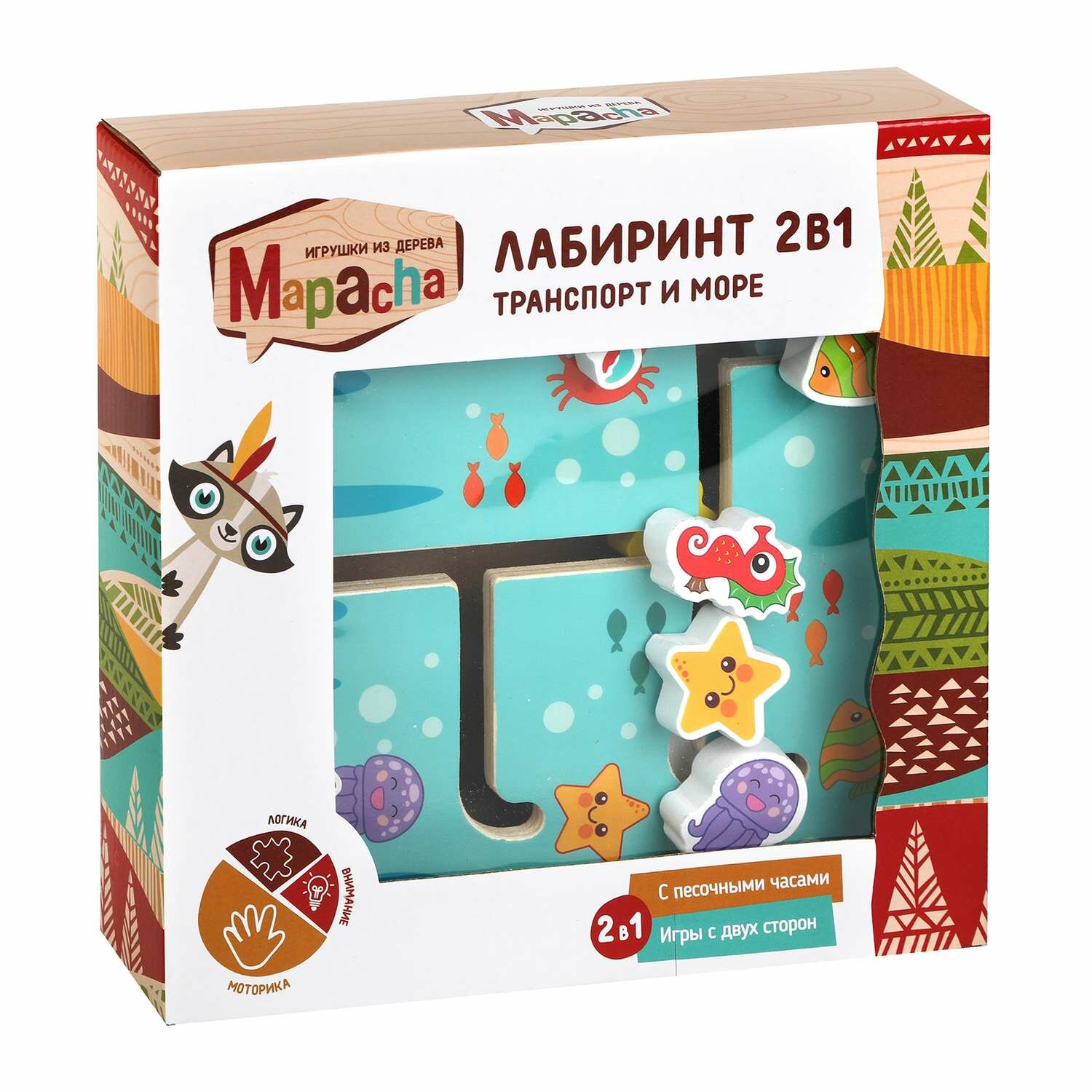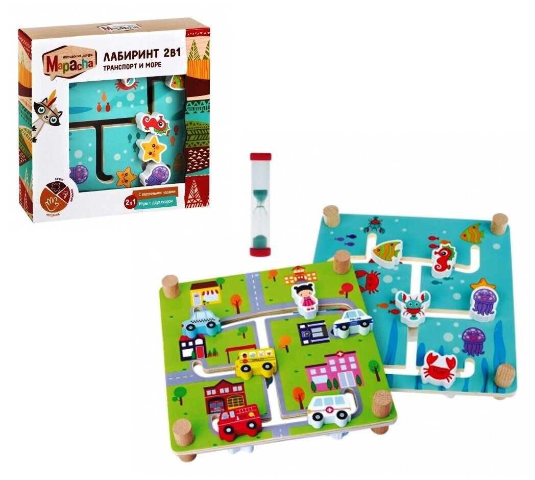 Деревянная игрушка Mapacha Лабиринт двухсторонний 2 в 1 с песочными часами Транспорт и море