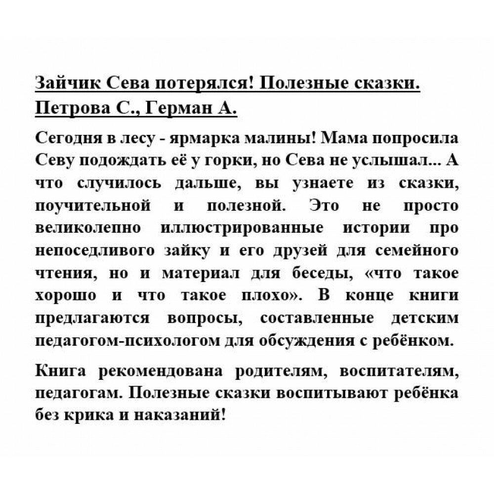 Сервис сравнения цен СкидкаГИД предлагает сравнить цены на товар «Книга: Зайчик Сева потерялся! Полезные сказки (Герман Ася); Издательский дом "Питер", 2022»