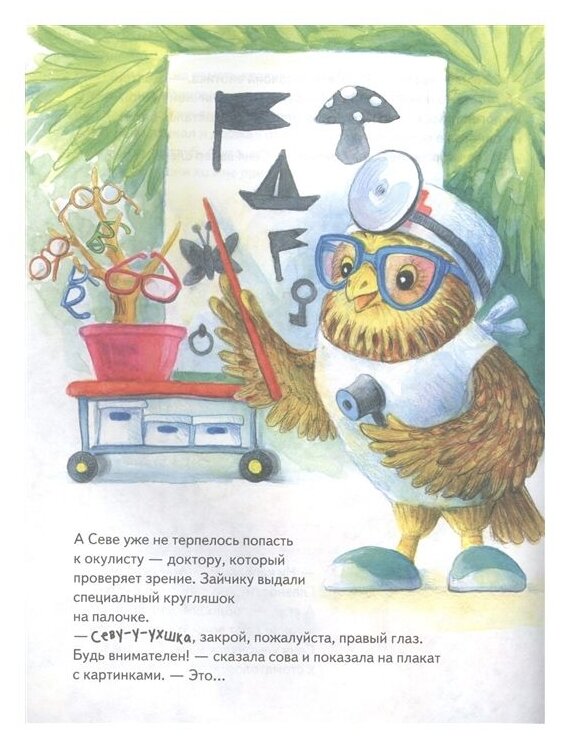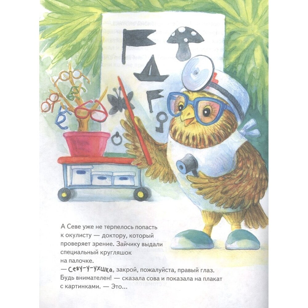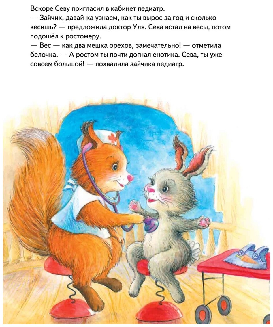 В детском саду воспитательница Зая Петровна объявила, что всем зверятам нужно пройти осмотр врачей в поликлинике: малышей ждут стоматолог, окулист и педиатр. Ох, зайчик Сева не на шутку испугался... А что случилось дальше, вы узнаете из сказки, поучительной и полезной. Это не просто великолепно иллюстрированные истории про непоседливого зайку и его друзей для семейного чтения, но и материал для беседы "Что такое хорошо и что такое плохо". В конце книги предлагаются вопросы, составленные детским педагогом-психологом для обсуждения с ребёнком.