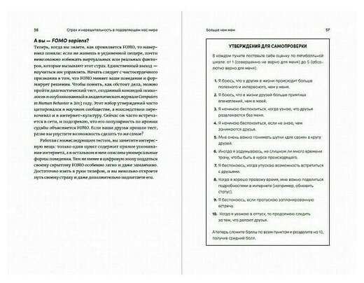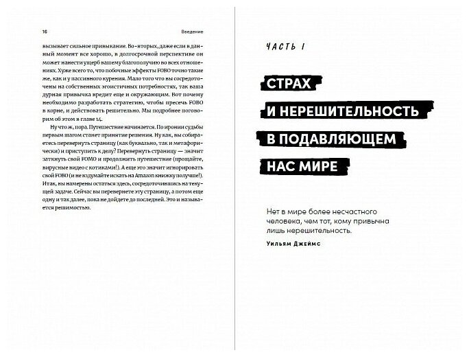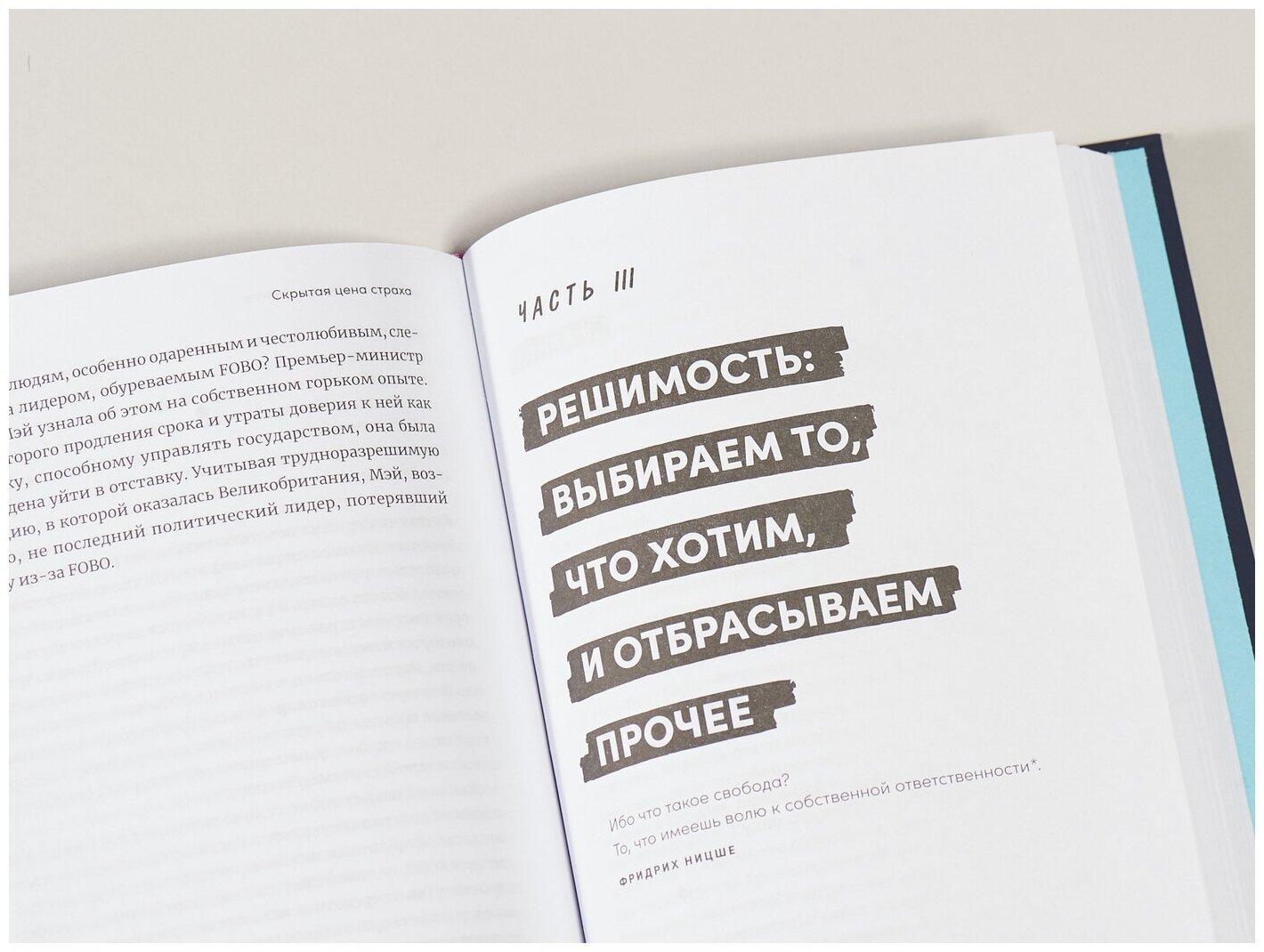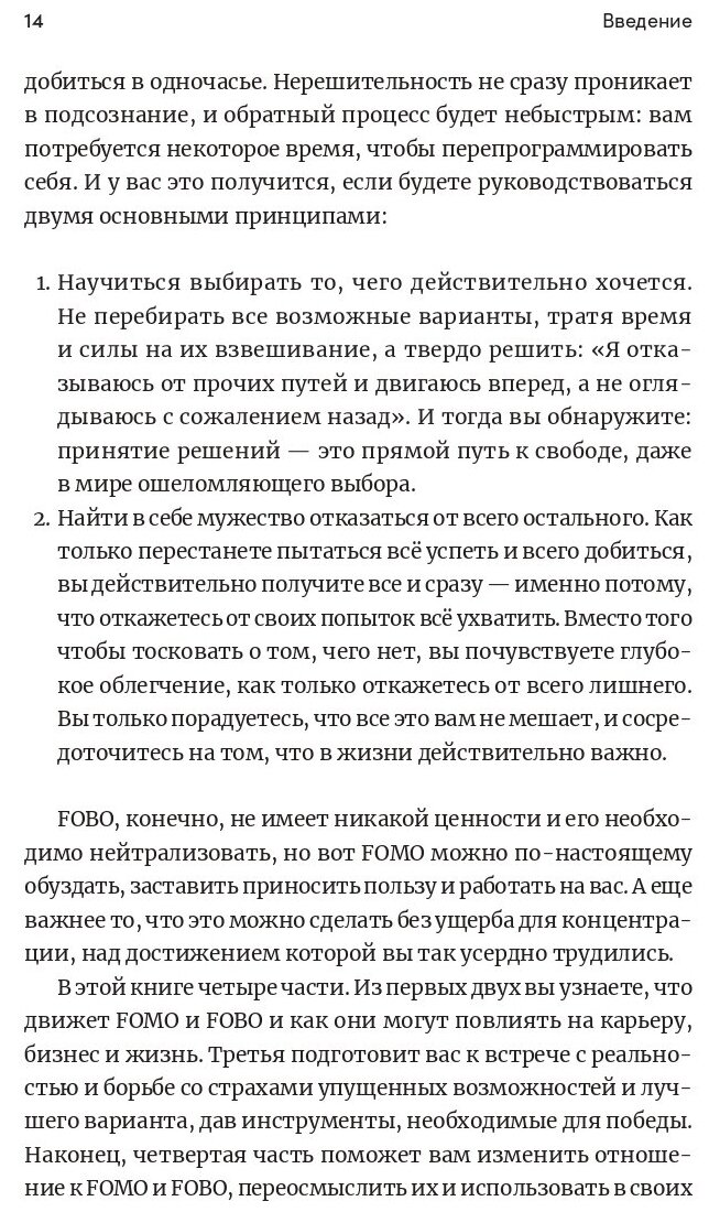 От этой книги осталось двойственное ощущение. С одной стороны, в начале идет очень много новой (для меня) и полезной информации: о FOMO и FOBO и о том, как они влияют на нашу жизнь. Однако, после первых двух глав появляется ощущение, что читаешь просто какую-то воду, призванную увеличить объем книги. Интересные рассуждения и примеры из жизни, но, вся суть - максимум, в первой половине книги. Остальное можно не читать, и при этом, вы ничего не потеряете.