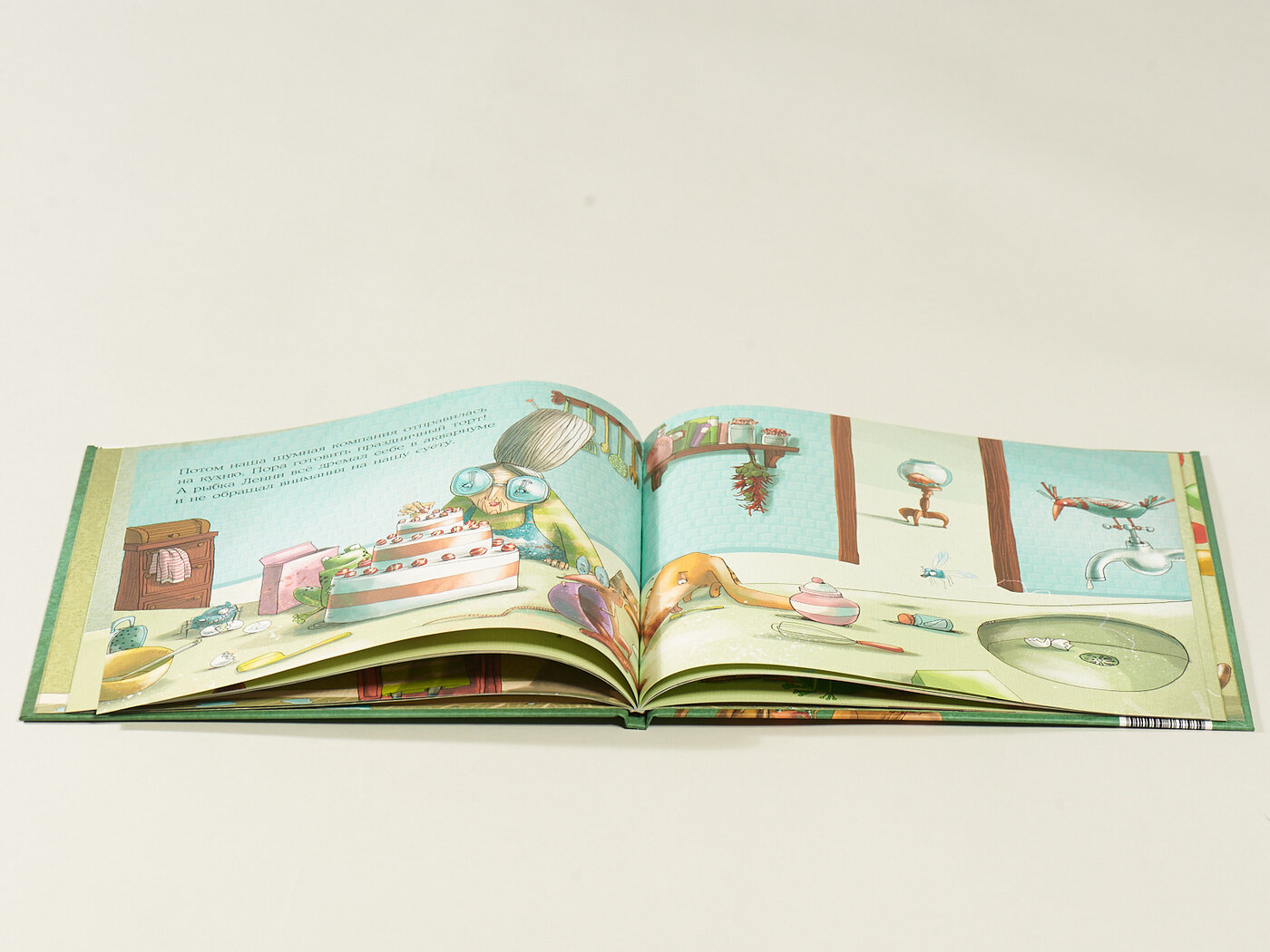 «Потом наша шумная компания отправилась на кухню. Пора готовить праздничный торт! А рыбка Ленни всё дремал себе в аквариуме и не обращал внимания на нашу суету».