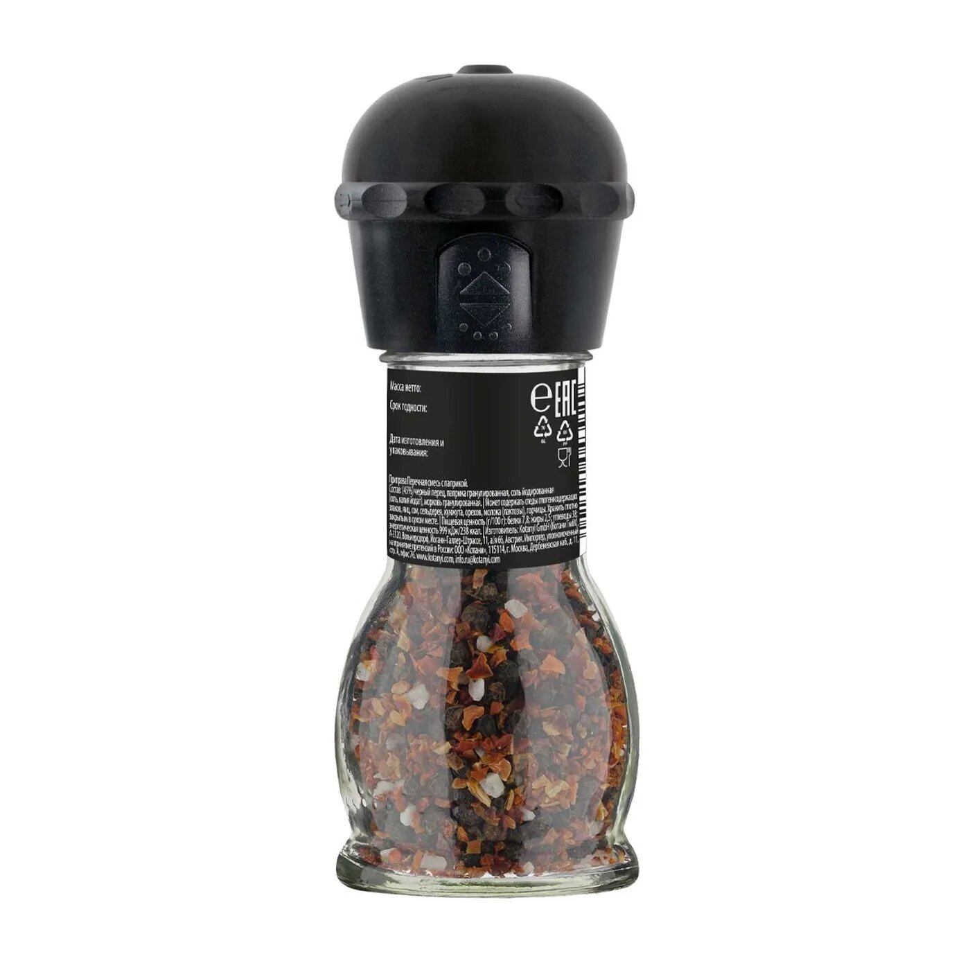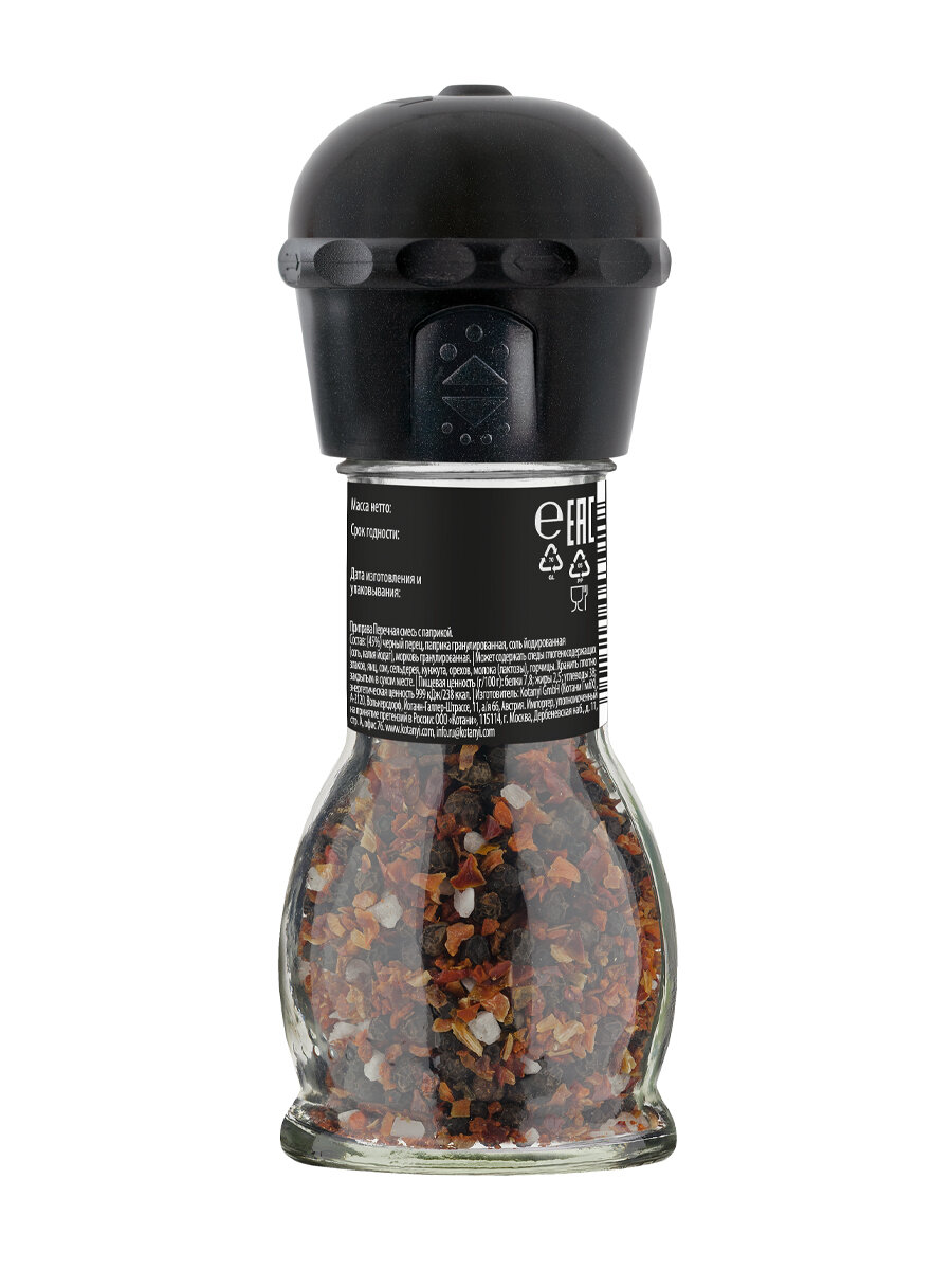 | Состав | (45%) черный перец, паприка гранулированная, соль йодированная (соль, калия йодат), морковь гранулированная. |