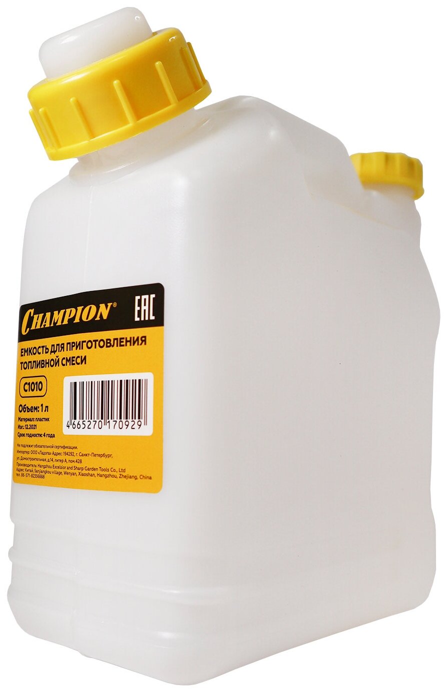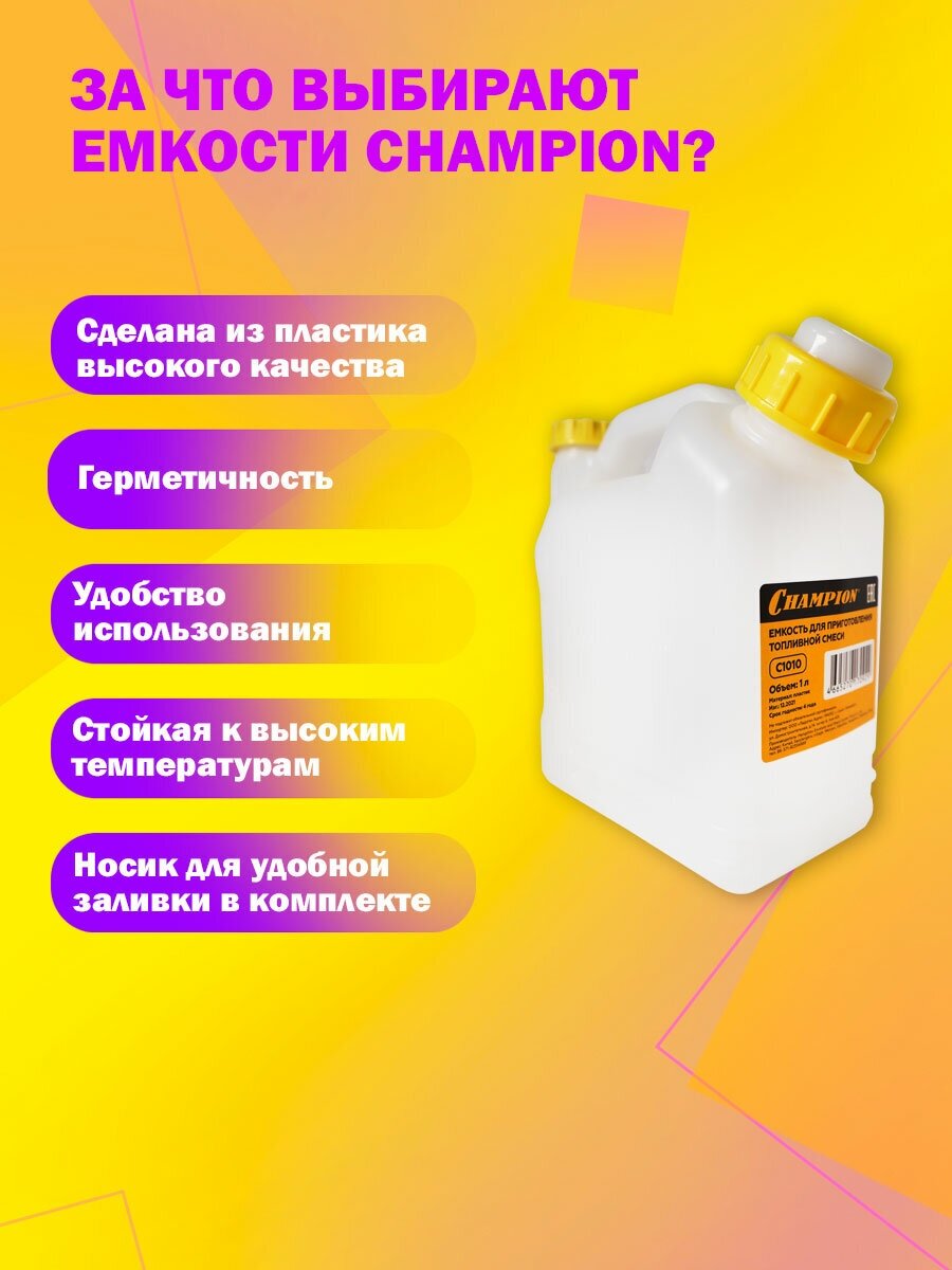 Емкость Champion предназначена для смешивания масла с бензином и дальнейшего его использования. Оснащена дозатором, в который заливается необходимое количество масла в соответствии с инструкцией для вашей бензотехники. В саму канистру заливается бензин и все тщательно перемешивается. Оснащена специальным носиком для удобной заливки.