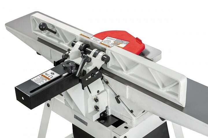JJ-6OS — фуговальный станок с длинными чугунными столами для любительского применения. Имеет классический дизайн с регулировкой высоты столов по наклонным направляющим. Базируется на открытой подставке, в пространстве которой расположен асинхронный однофазный двигатель. Привод ножевого барабана одним клиновым ремнем. Регулируемый фуговальный упор и его кронштейн сделаны из массивных чугунных отливок. Сдвижной защитный экран – алюминиевый. Стружка удаляется через 100-миллиметровый патрубок и кожух, расположенные снизу станка.