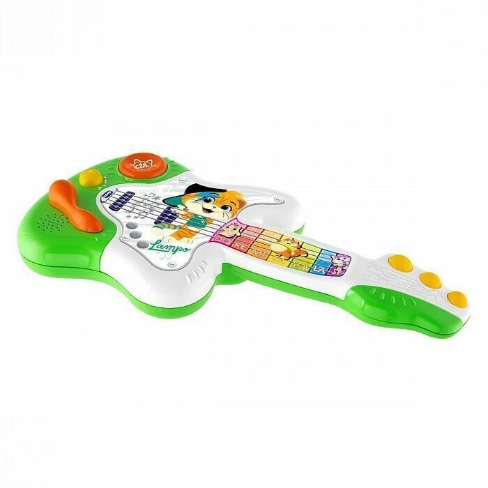 Музыкальная игрушка Гитара в стиле мультфильма и персонажей «44 котенка» с изображением кота Лампо, со струнами и интерактивными кнопками. Возможность переключать музыкальные режимы на 11 кнопках. 3 развивающих режима: фристайл со слушанием песен и гитарных звуков, исполнением аккордов; Lampo с изучением музыкальных нот; чувствуй ритм с сочинением мелодии по определенному ритму .