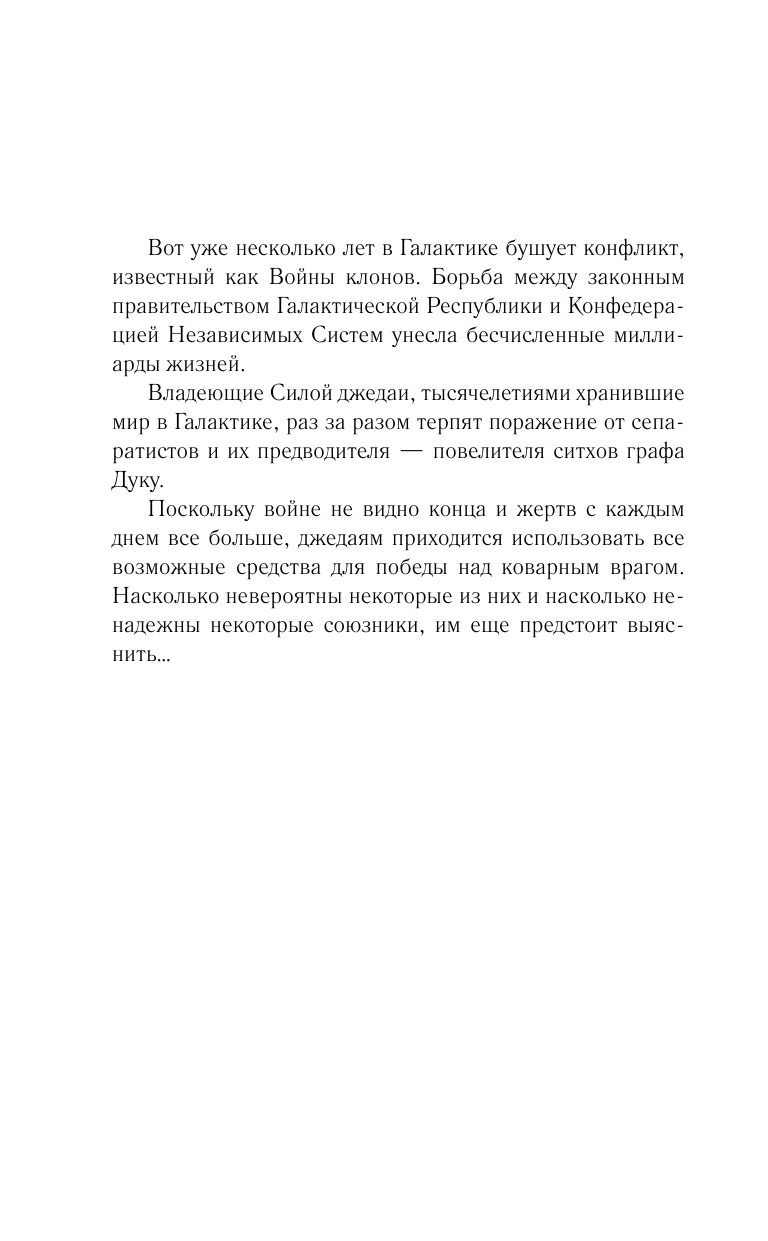 Примитивная история, текст простой как три копейки. Сравните с Мэтью Стровером ("Уязвимая точка"), как он показал взаимоотношение джедаев между собой и с внешним миром, глубину их мировоззрения. Короче, это первая книга по ЗВ, которую я после прочтения, без сожаления перепродал на Авито.