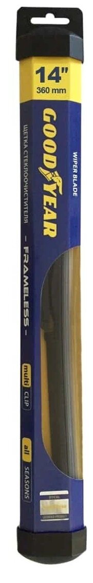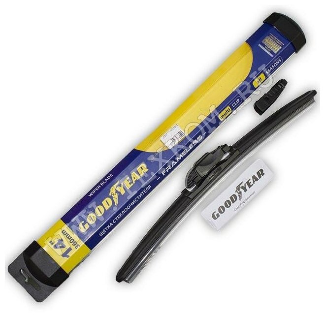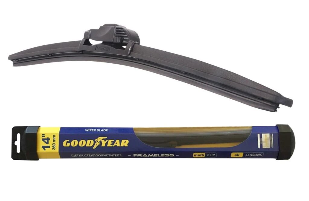 Уникальная бескаркасная щетка стеклоочистителя Goodyear Frameless с системой крепления MultiClip, подходит на 95% автомобилей Российского автопарка без использования переходников. Благодаря MultiСlip установка становится легкой и доступной даже для ребенка. Морозостойкий аэродинамический спойлер обеспечивает плотное прилегание лезвия к стеклу и качественную очистку даже при высокой скорости. Каркас щетки усилен дополнительными направляющими из нержавеющей стали. Стеклоочистители сохраняют превосходные чистящие свойства как в мороз (до -40 С), так и в жару (выдерживает до +70 С).