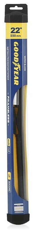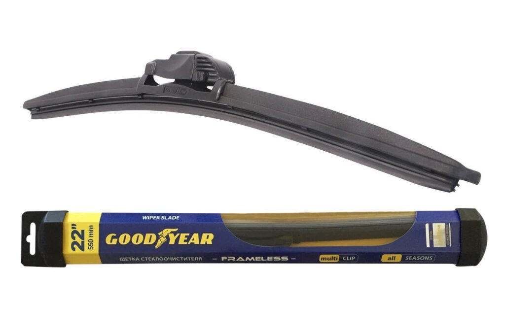 Уникальная бескаркасная щетка стеклоочистителя Goodyear Frameless с системой крепления MultiClip, подходит на 95% автомобилей Российского автопарка без использования переходников. Благодаря MultiСlip установка становится легкой и доступной даже для ребенка. Морозостойкий аэродинамический спойлер обеспечивает плотное прилегание лезвия к стеклу и качественную очистку даже при высокой скорости. Каркас щетки усилен дополнительными направляющими из нержавеющей стали. Стеклоочистители сохраняют превосходные чистящие свойства как в мороз (до -40 С), так и в жару (выдерживает до +70 С).