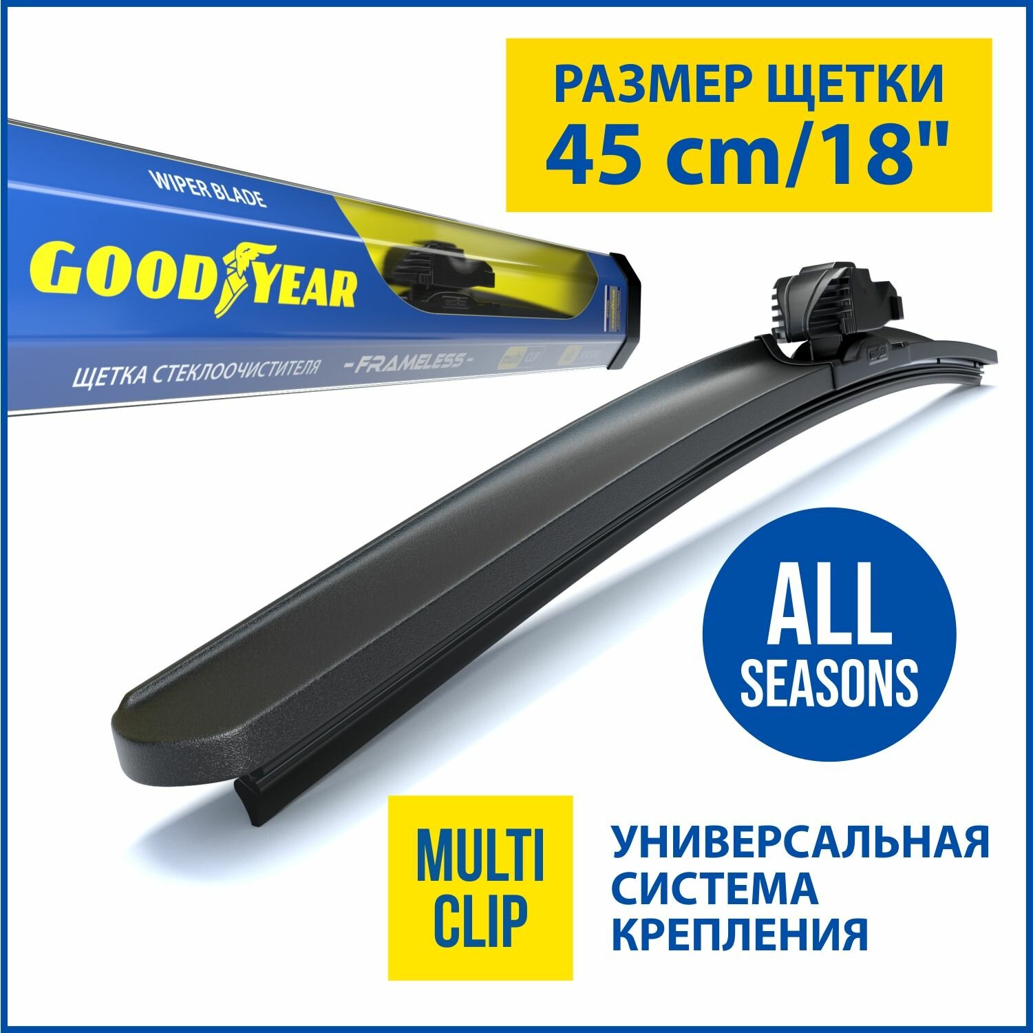 Уникальная бескаркасная щетка стеклоочистителя Goodyear Frameless с системой крепления MultiClip, подходит на 95% автомобилей Российского автопарка без использования переходников. Благодаря MultiСlip установка становится легкой и доступной даже для ребенка. Морозостойкий аэродинамический спойлер обеспечивает плотное прилегание лезвия к стеклу и качественную очистку даже при высокой скорости. Каркас щетки усилен дополнительными направляющими из нержавеющей стали. Стеклоочистители сохраняют превосходные чистящие свойства как в мороз (до -40 С), так и в жару (выдерживает до +70 С).