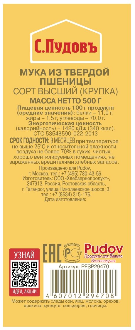Мука С.Пудовъ из твердой пшеницы высший сорт 500г