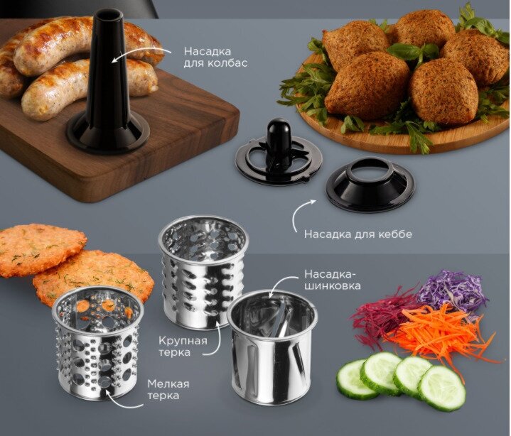| Насадки | для приготовления колбасы, для приготовления сосисок, кеббе, овощерезка |