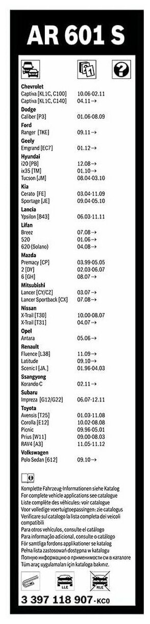 | Длина щетки стеклоочистителя | 600 мм |