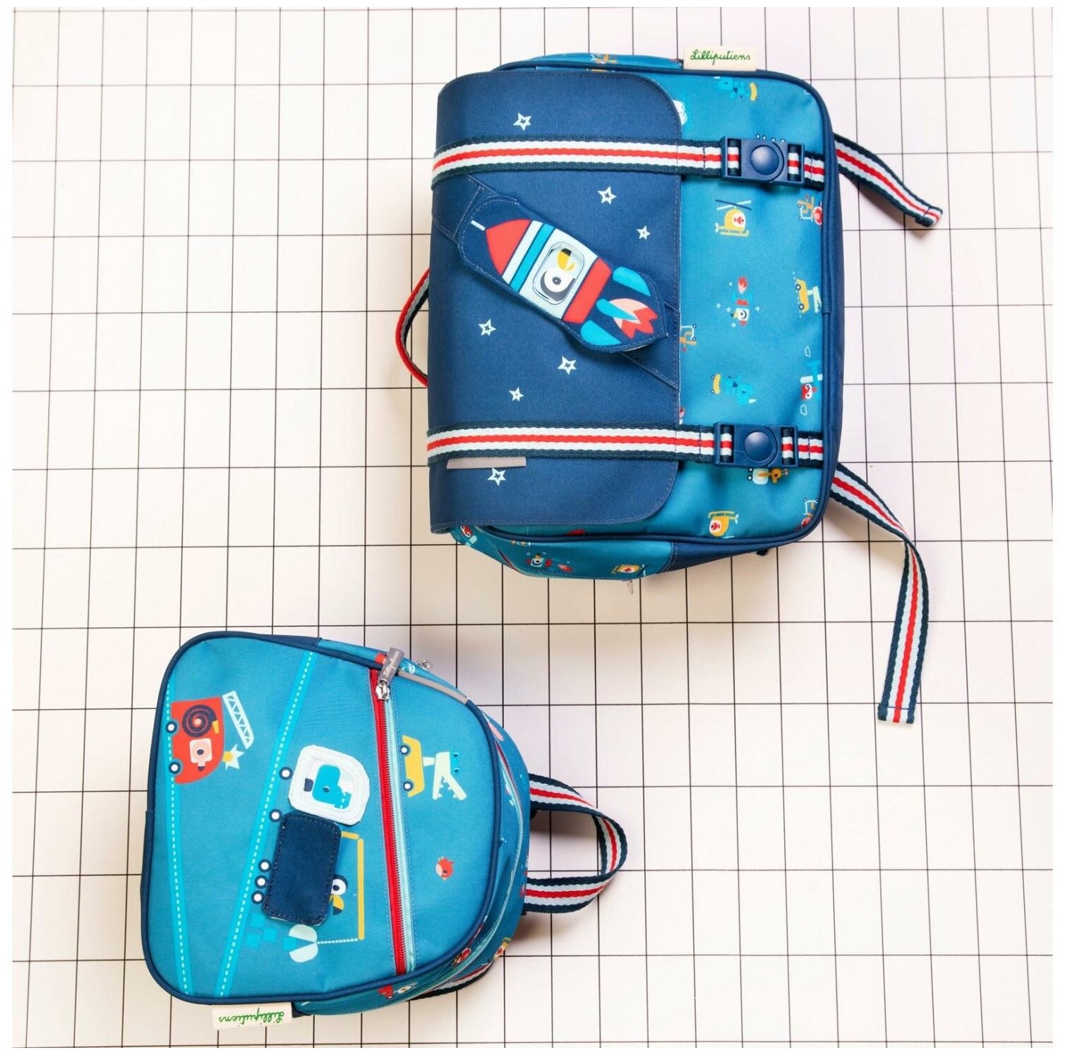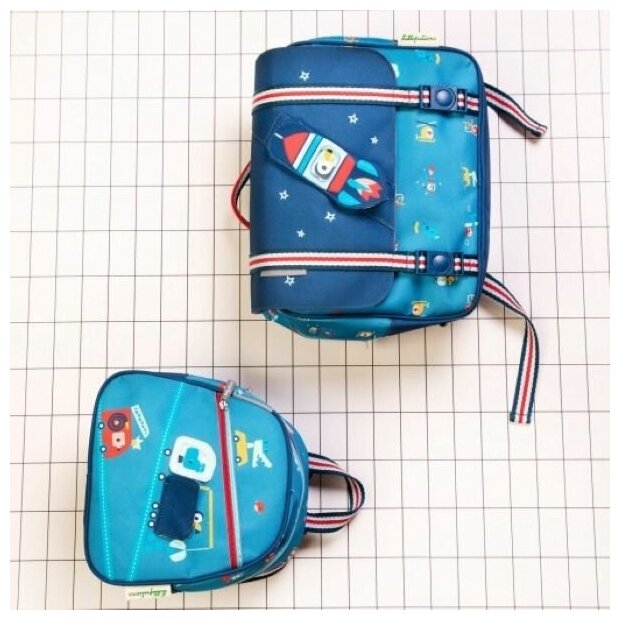 Рюкзак выполнен из водоотталкивающей ткани. Одно отделение на молнии, сверху закрывается на клапан с застежками, регулируемые лямки, фиксирующая застежка спереди, ручка для переноски/подвешивания, возможность указания имени ребенка и контактного телефона.