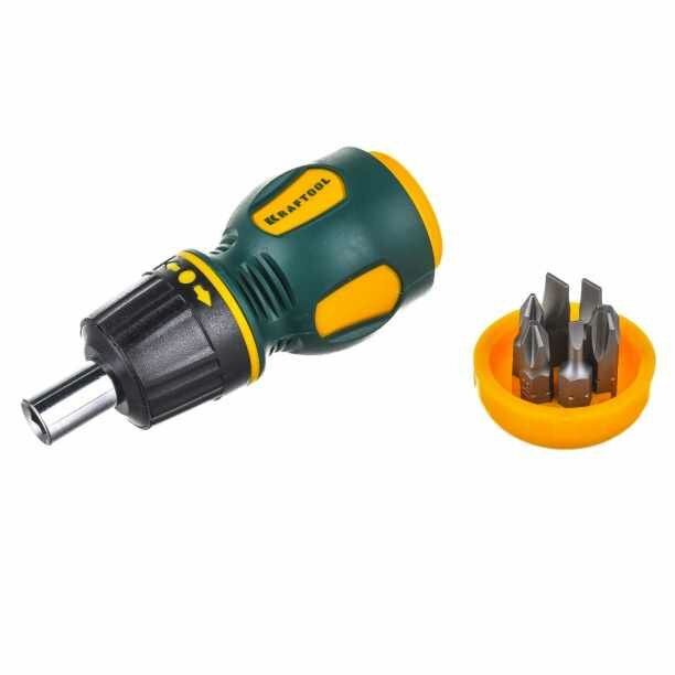 Реверсивная отвертка Kraftool Набор имеет 6 бит: 3 типа PH и 3 типа SL. Инструмент и оснастка изготовлены из хромванадиевой стали высокого качества, что позволяет выдерживать значительные нагрузки. Двухкомпонентная рукоятка обеспечивает надежный хват и не скользит в руке. С помощью магнитного держателя замена и удержание насадок осуществляется легко и просто.