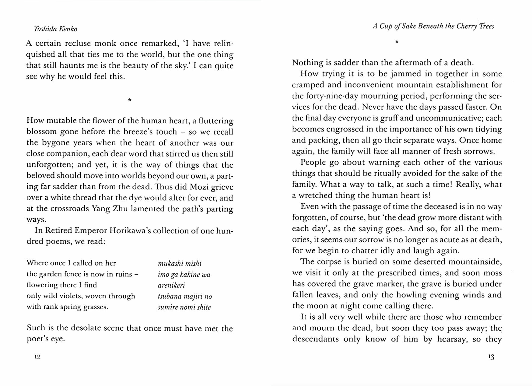 Moonlight, sake, spring blossom, idle moments, a woman's hair - these exquisite reflections on life's fleeting pleasures by a thirteenth-century Japanese monk are delicately attuned to nature and the senses.