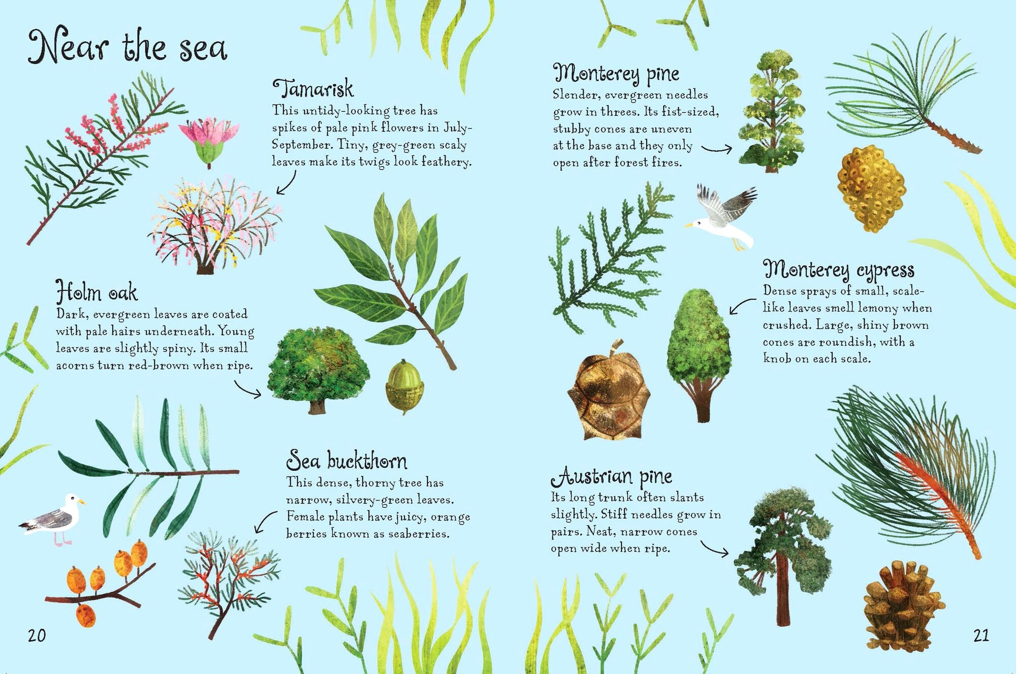 Readers can identify 60 trees, from sweet chestnut and eucalyptus to bay willow and juniper with this beautiful little book. The pages are organised by location, showing trees you might find in towns and gardens, parks, woodlands and near the sea. There’s also a spotting chart and stickers to add so you can keep track of trees you’ve spotted.