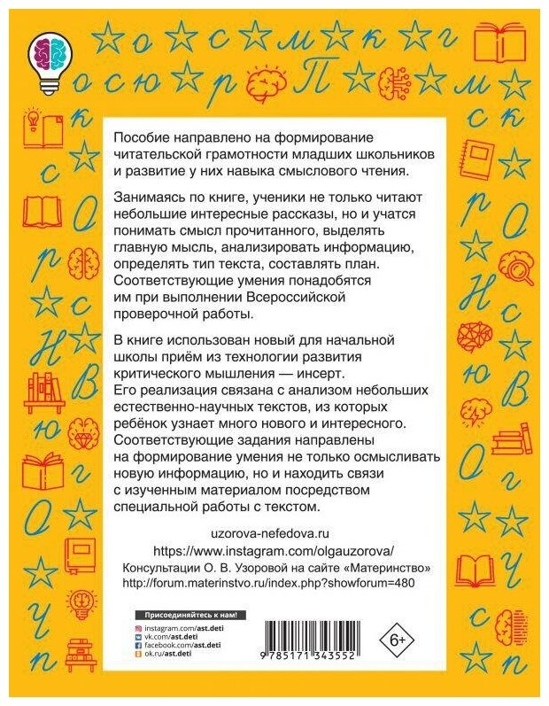 Тексты небольшие, интересны и познавательны для детей. Читая их и выполняя задания, ребенок сможет отработать важные учебные навыки: определять тему, главную мысль, тип текста. Формат книги очень удобен. Можно брать с собой в дорогу, чтобы с пользой провести время. Советую приобрести).