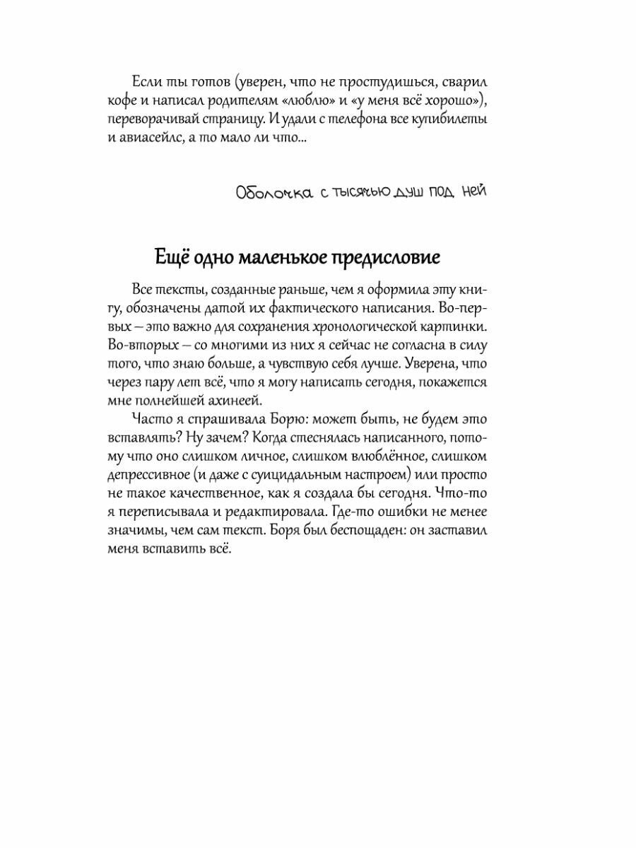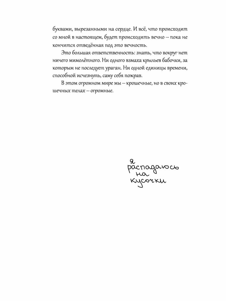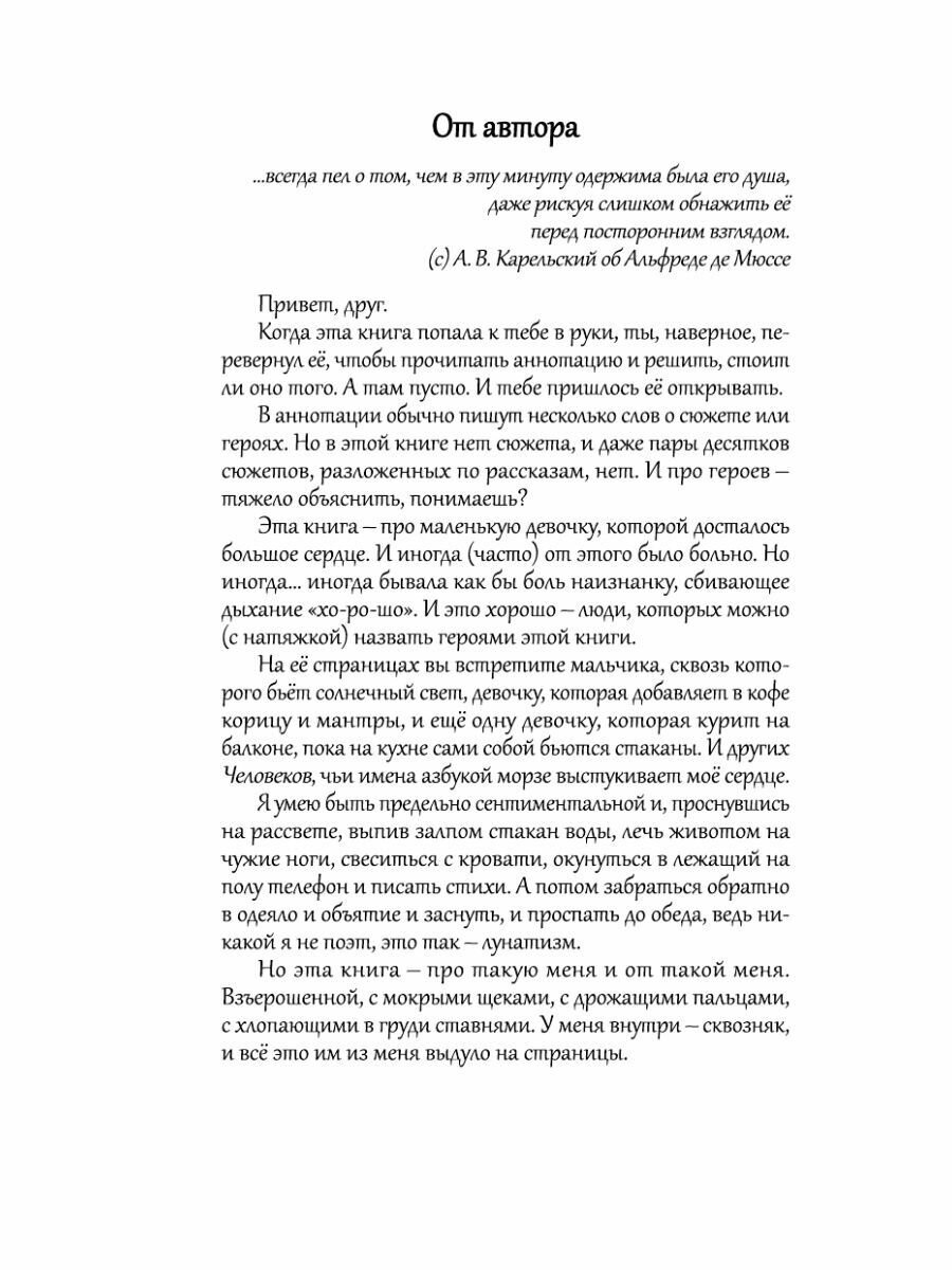 Эта книга – про маленькую девочку, которой досталось большое сердце. И иногда (часто) от этого было больно. Но иногда… иногда бывала как бы боль наизнанку, сбивающее дыхание «хо-ро-шо». И это хорошо – люди, которых можно (с натяжкой) назвать героями этой книги. На её страницах вы встретите мальчика, сквозь которого бьёт солнечный свет, девочку, которая добавляет в кофе корицу и мантры, и ещё одну девочку, которая курит на балконе, пока на кухне сами собой бьются стаканы.
