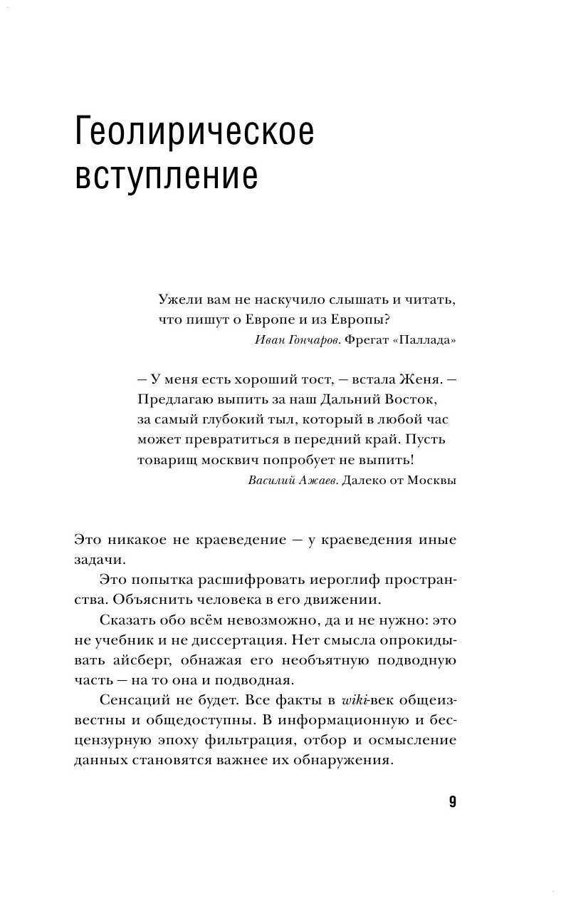 Если верить словам автора, книга обещала геолирику. На самом же деле оказалась переживаниями больших едва кое-где наполненных пространств административно-территориальной и политической картографии, то есть малосвязанных лоскутов из чудовищных размеров федерального округа. Перефразируя – лоскутная люмпен-политология глобуса Дальнего Востока без ручки, но с правым рулём. Да ещё и политически ангажированная. Никакой лирика!