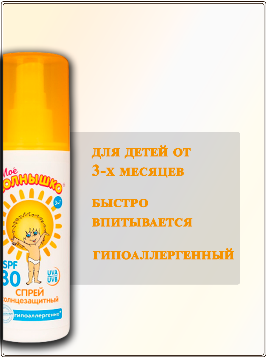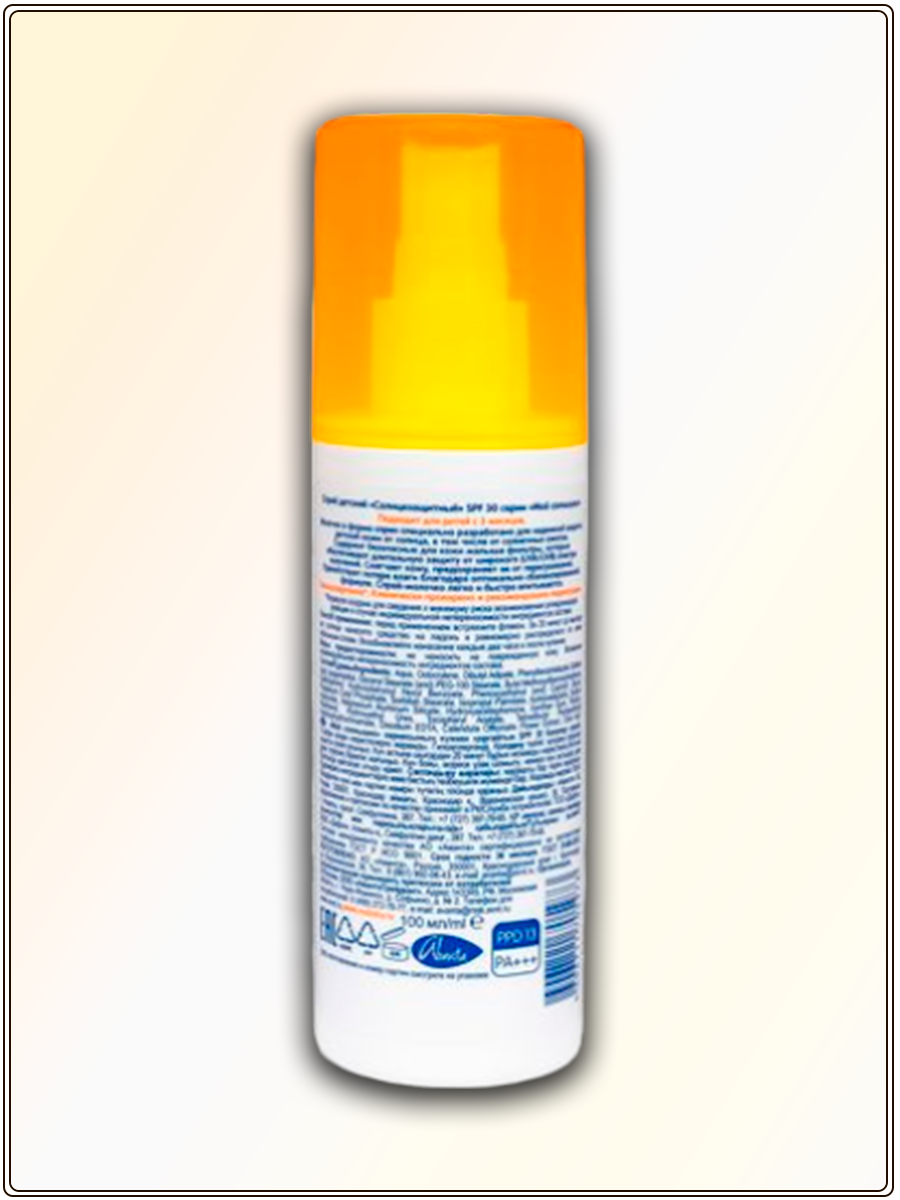 Специально разработан для надежной защиты детской кожи от солнца, в том числе от солнечных ожогов. Содержит безопасные для кожи малыша фильтры, которые обеспечивают длительную защиту от широкого спектра UVA/UVB. Смягчает кожу, предохраняет ее от пересушивания. Препятствует потере влаги благодаря оптимально сбалансированной формуле.Спрей легко наносится и быстро впитывается.Подходит для детей с 3 месяцев.Гипоаллергенно.*Клинически проверено и рекомендовано педиатрами.*Формула создана для сведения к минимуму риска возникновения аллергической реакции в случае индивидуальной непереносимости ингредиентов состава.