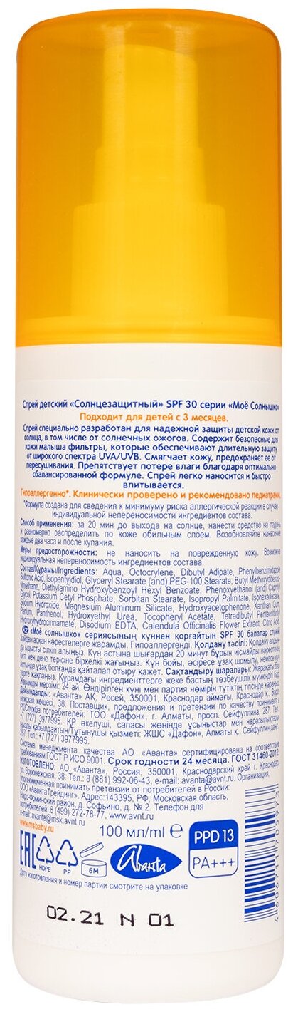 Спрей детский солнцезащитный Мое солнышко SPF30 100мл Аванта ОАО (486967)