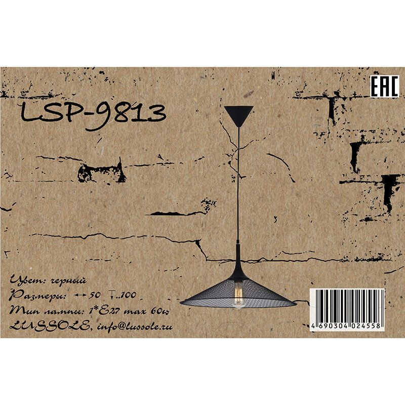 Подвесной светильник LSP-9813 - продукт известной компании Loft (Италия). Имеет максимальную мощность 60 Вт, освещает площадь до 3 кв. м. Отлично подойдет для таких мест, как гостиная, кафе, кухня, над обеденным столом, над кухонным островом. Впишется в интерьеры следующих стилей: лофт.
