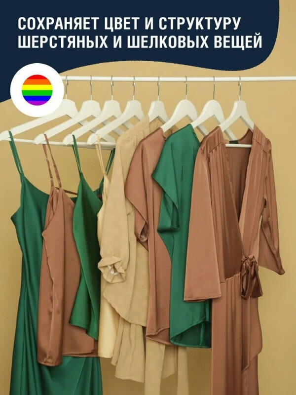 Гипоаллергенная бережная формула на основе безопасных растительных ингредиентов деликатно ухаживает за тканями из шерсти, шелка, кашемира, в том числе из смешанных волокон, трикотажа и микрофибры.