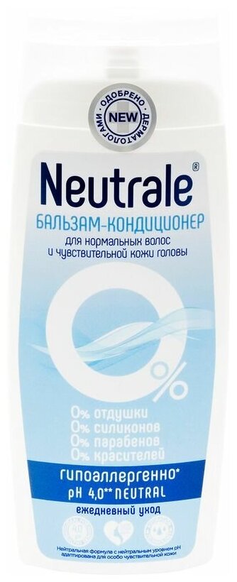 Бальзам-кондиционер одобрен дерматологами. Предназначен для ежедневного использования. Для всей семьи. Формула с нейтральным pH адаптирована для особо чувствительной кожи. Уровень pH варьирует в пределах 3,5-4,5. Не содержит отдушки, красителей, парабенов, силиконов.