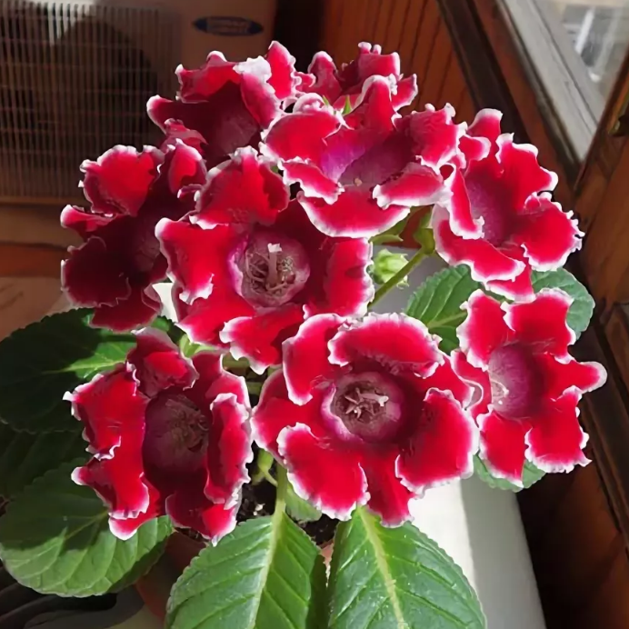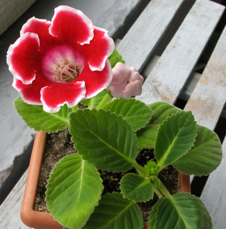 Роскошное и очень модное среди цветоводов комнатное растение из семейства Геснериевые. Самая рано зацветающая серия среди немахровых глоксиний. Цветки колокольчатой формы, красные с белым краем, с приятной бархатистой поверхностью венчают длинные цветоносы. Широкоовальные листья на коротких черешках украшают основание цветоноса. На взрослом растении образуется 10-15 крупных цветков, создавая впечатление нарядного букета. Глоксиния предпочитает светлые, солнечные места без воздействия прямых солнечных лучей. Идеальная температура для роста - 20оС - 25оС днем и 18оС - 22оС ночью. Во время цветения необходим обильный полив, еженедельные подкормки, влажный воздух (опрыскивание из пульверизатора). В октябре-ноябре, после цветения, полив и подкормку прекращают. Когда листья глоксинии засохнут, клубни вынимают из почвы и помещают на хранение в неглубокие ящички с чуть влажным песком или перлитом, которые устанавливают в помещении с температурой 10-12оС. После периода покоя (примерно 90 дней) клубни дадут новые ростки и их снова можно будет пересаживать в горшок. Семена на рассаду высевают поверх субстрата (не заделывая в почву) с февраля по март, накрывают стеклом и ставят в теплое, светлое место. Всходы появляются при температуре 22-24оС, через 10-14 дней. В фазе 3-х листьев растения пикируют, через месяц рассаживают в отдельные горшки. Зацветает глоксиния выращенная из семян через 9-10 месяцев.