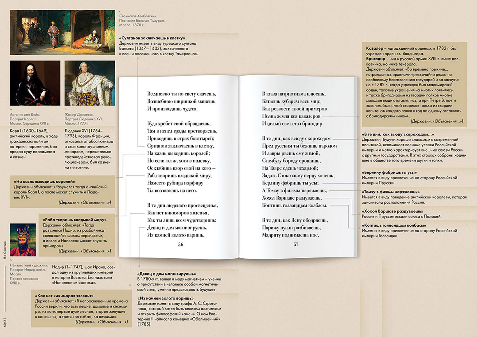 Подробный иллюстрированный комментарий к произведениям, выполненный в формате "книга в книге", воссоздает культурный фон XVIII века, представляет Г. Р. Державина как ведущего поэта эпохи, литературного новатора, общественного деятеля, гражданина, мыслителя.