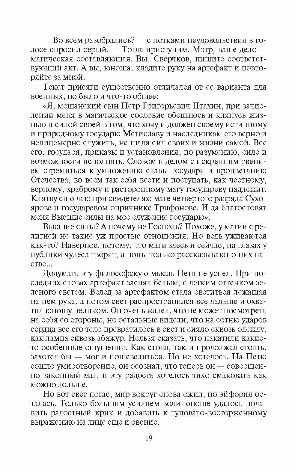 Скучно-с, господа, товарищи. Маг с психологией приказчика в купеческой лавке. Отсюда – постоянно мысли: «А что я с этого буду иметь?» И если что-то им и делается бескорыстно, то это только либо с перепугу за свою жизнь, либо, скрепя сердце, потому как нет выхода. Все же, какой-никакой целитель. По сути – действия в книге, как такового, и нет. Учится, постоянно тренирует магические умения. Так, в самом конце немного повоевал, да и то: жить захочешь – не то сделаешь. В общем, несмотря на то, что книги Смекалина у меня есть практически все, и я их даже иногда перечитываю, эта книга ушла в подъезд, на окошко. Может, кому-то и понравится. Заказ на вторую книгу аннулировала.